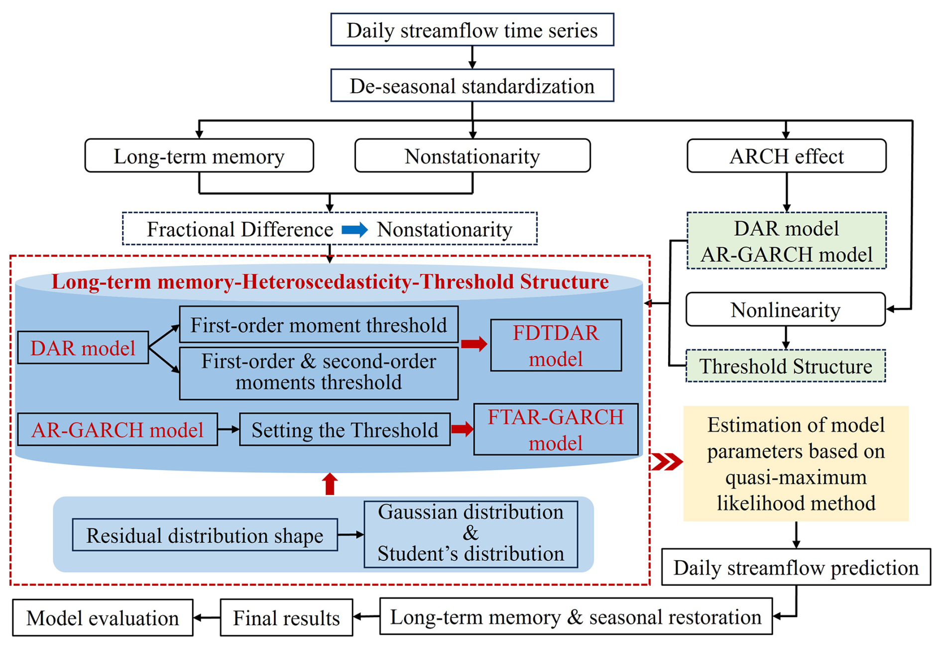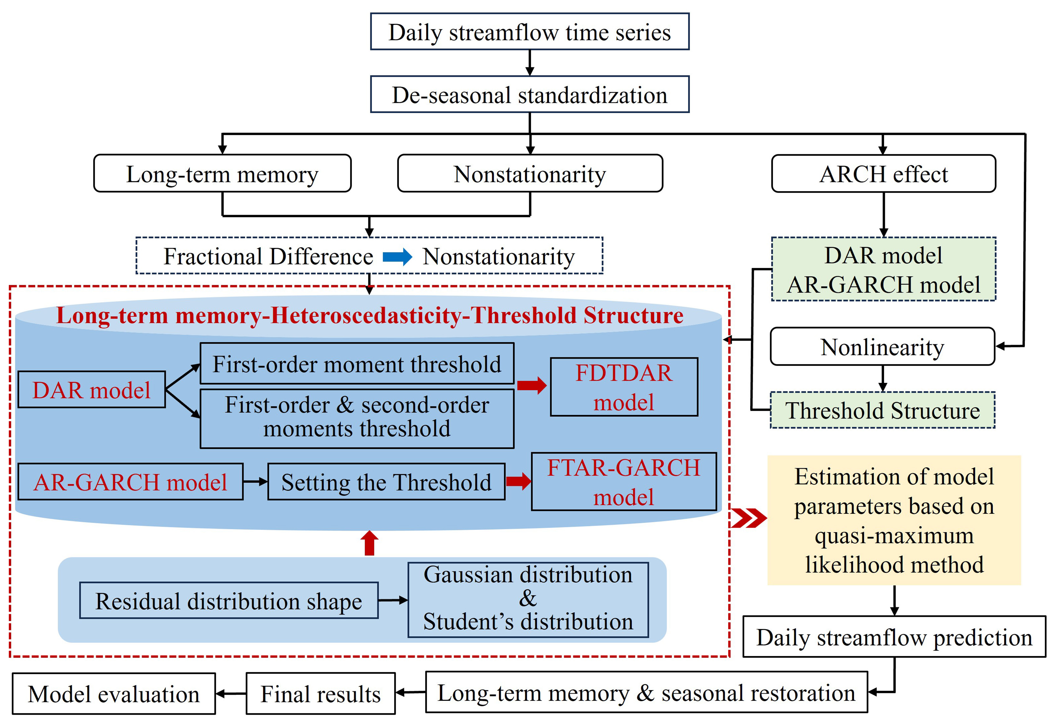 This study aims to improve the prediction accuracy of daily streamflow time series by constructing a novel model with high applicability that can simultaneously capture seasonality, non-stationarity, long-term memory, and nonlinearity of daily streamflow. We propose the Fractional-differenced Dual-Threshold Double Autoregressive (FDTDAR) framework that systematically integrates seasonal normalization, fractional differencing for long-memory modeling, and a dual-threshold structure to capture regime-specific nonlinearities. Furthermore, we evaluate alternative residual distributions – comparing the standard Gaussian distribution against the heavy-tailed Student's t-distribution – to improve residual characterization. The framework is applied to daily streamflow data from 15 gauging stations located in the Yellow River Basin. For robust evaluation, the historical data are divided into a 70 % calibration period and a 30 % out-of-sample testing period to assess the one-day-ahead forecasting performance. The FDTDAR framework is rigorously evaluated against both the classical linear AR-GARCH model and the long short-term memory (LSTM) network. Evaluation metrics include Mean Absolute Error (MAE), Root Mean Squared Error (RMSE), Coefficient of determination (R2), Nash-Sutcliffe efficiency coefficient (NSE), and Absolute Maximum Error (AME), providing a multi-faceted assessment of model robustness.