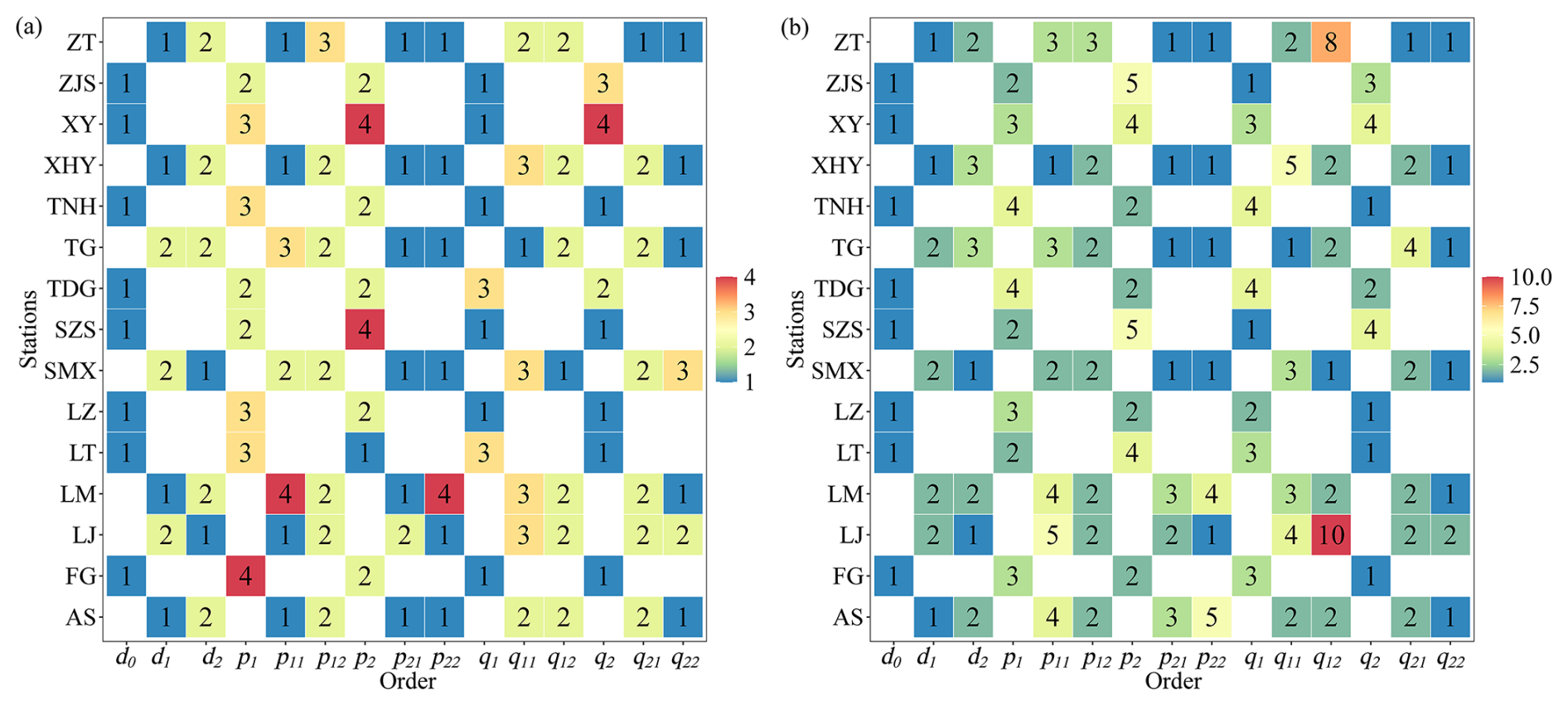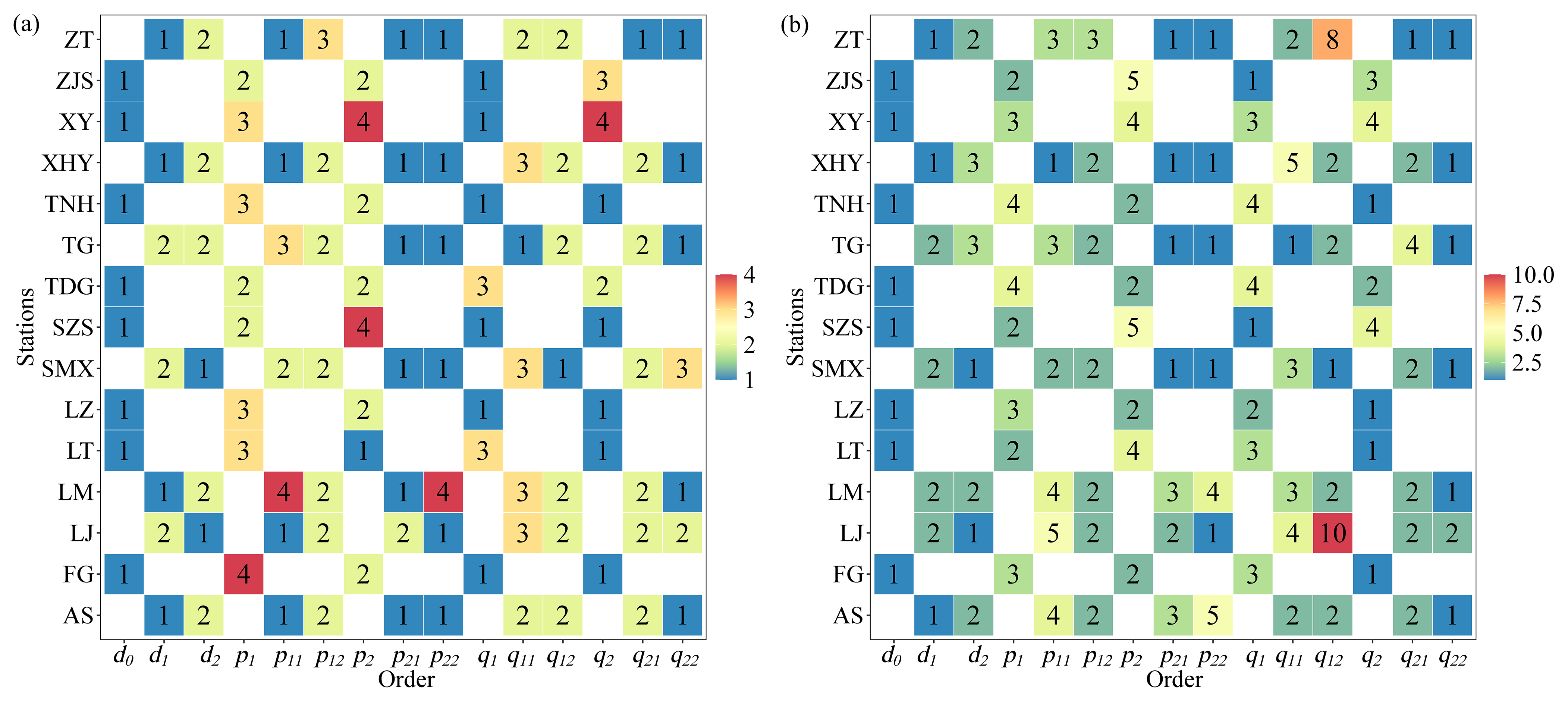 Obviously, as the order increases, the FDTDAR model's ability to describe time series becomes stronger. However, the accompanying large parameter set adds complexity to the model structure and reduces computational speed. Therefore, it is necessary to use a metric tool to determine the optimal order for the model. The evaluation of model quality generally depends on two aspects: the likelihood function value of parameter estimation and the number of unknown parameters in the model. A larger likelihood function value and a greater number of parameters indicate superior model fitting. However, the risk of “overfitting” arises when the simulation performance is excessively superior, leading to a decrease in accuracy during the prediction phase.