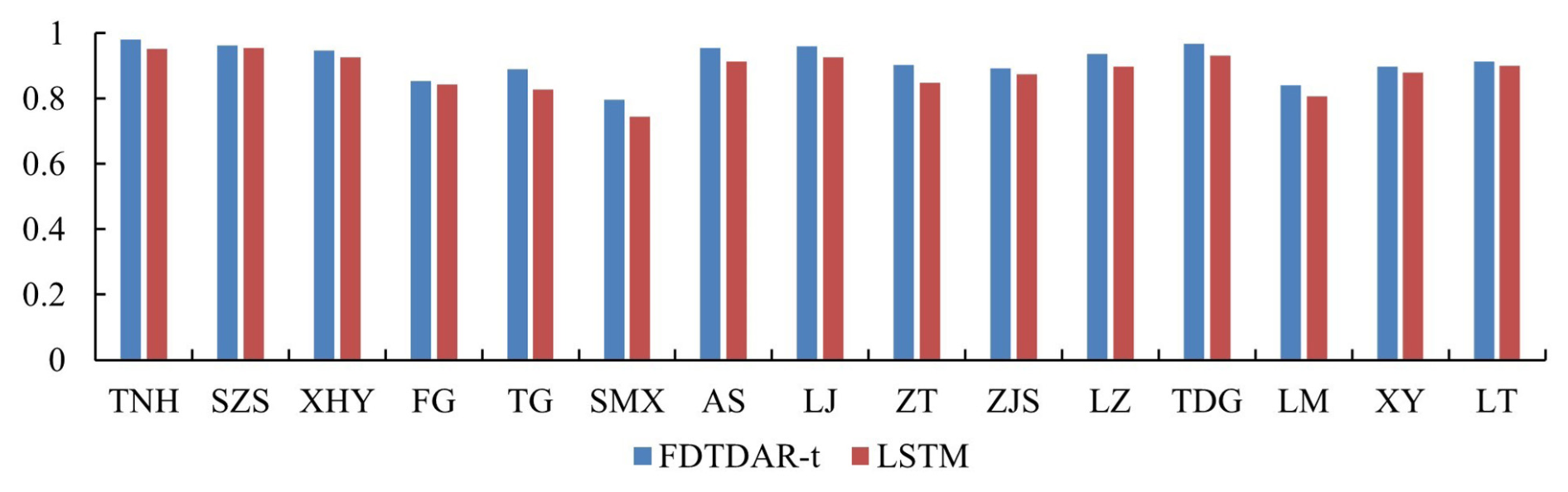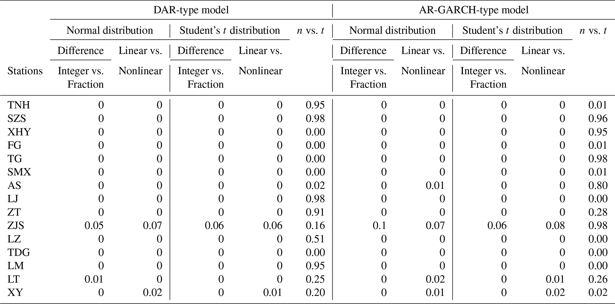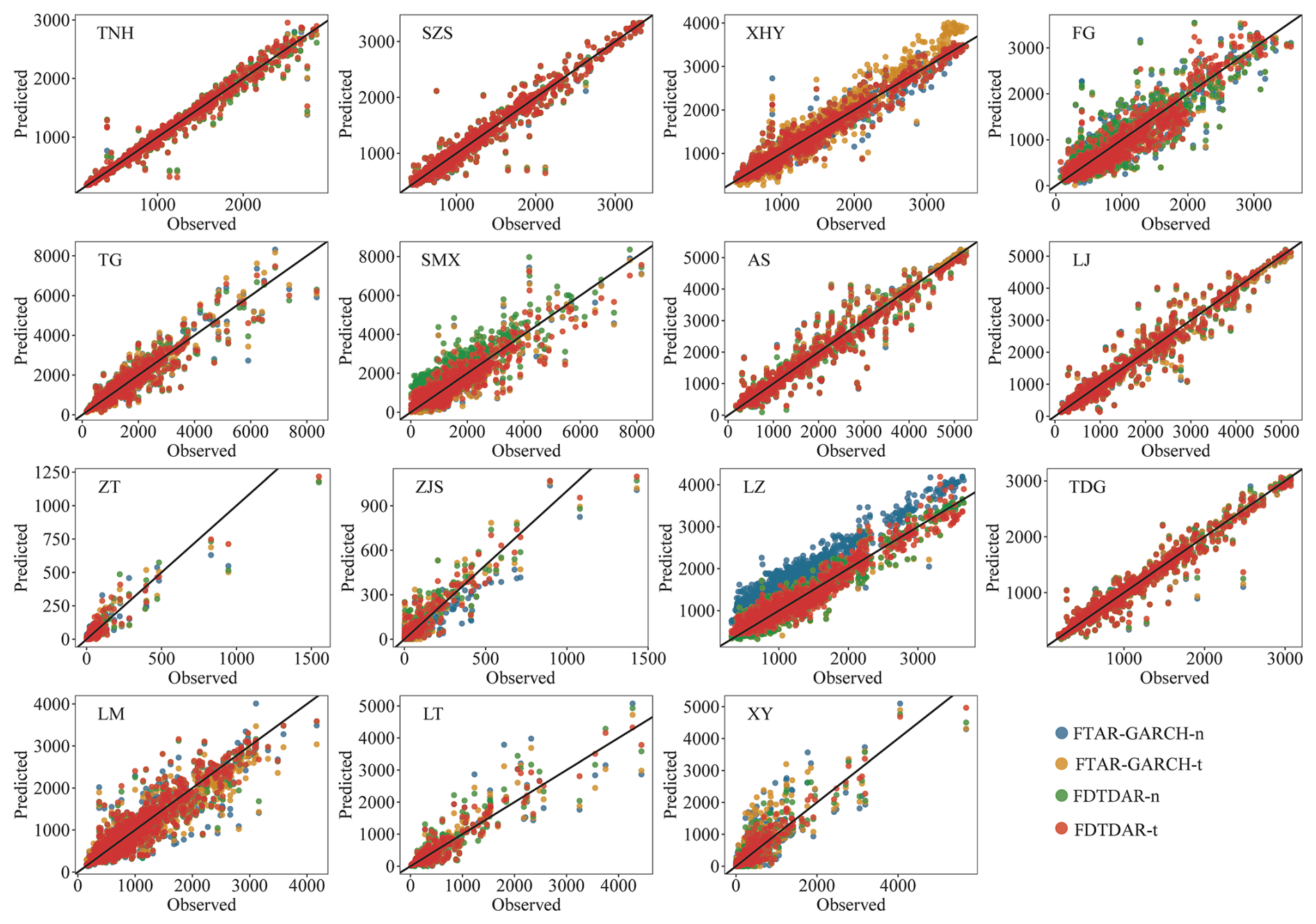 2. The nonlinear changes of the daily streamflow time series are reflected in multiple linear structures by adding the threshold, improving the accuracy of the single linear structure method. The NSE values of the FDTDAR and TAR-GARCH models are higher than those of the DAR and AR-GARCH models by 0.013–0.556 and 0.031–0.582, respectively.