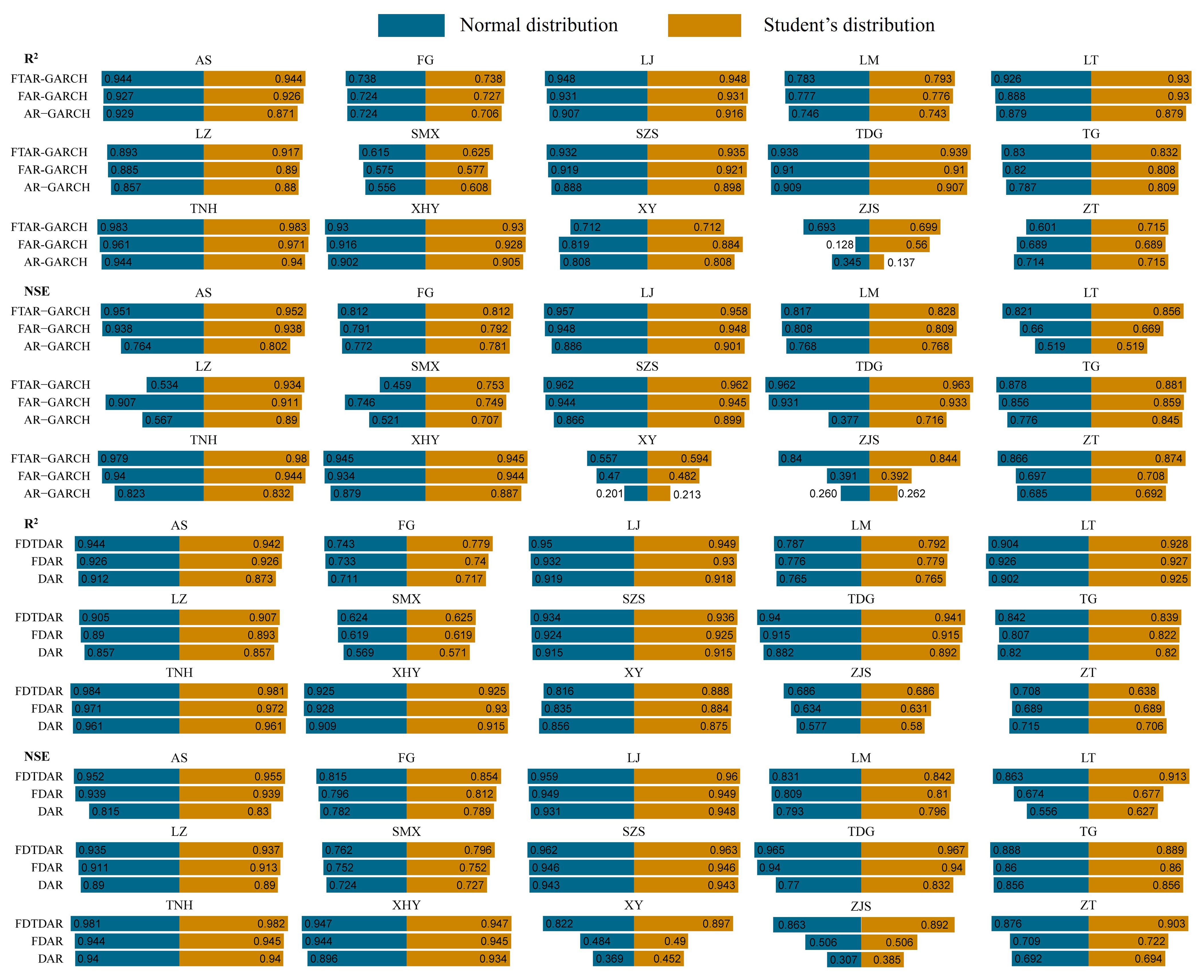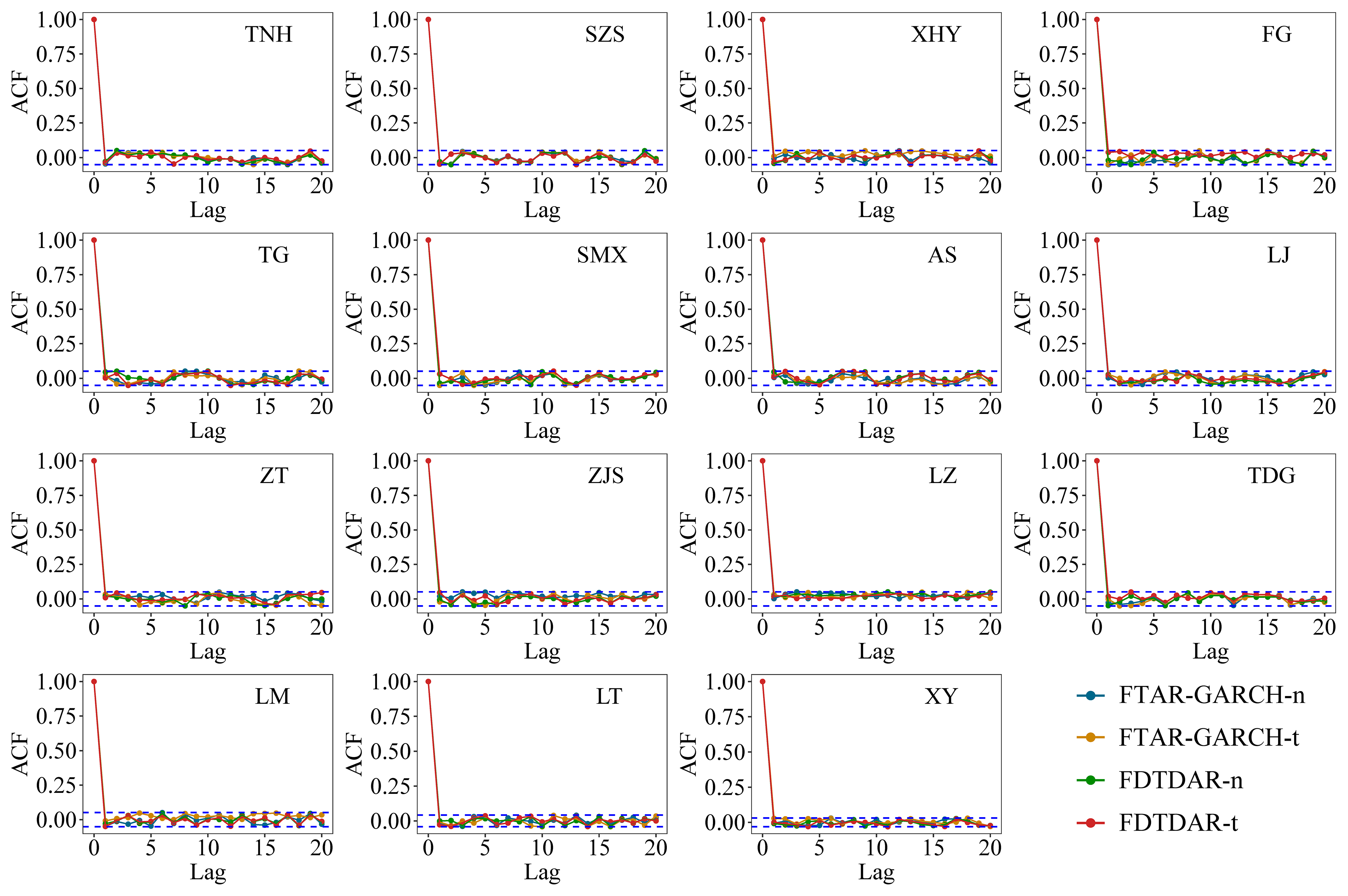 To evaluate the performance of the proposed FDTDAR model, we compare it with the FTAR-GARCH model, a widely used long-memory heteroscedastic model that also incorporates threshold effects.