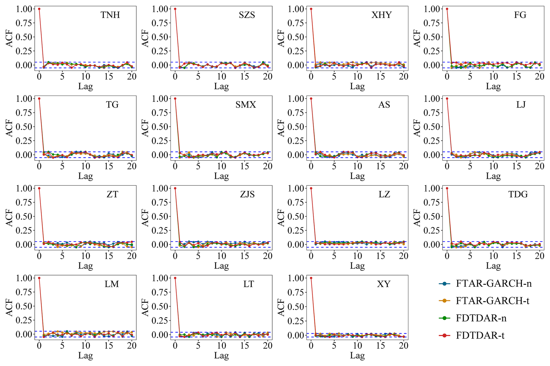 For clarity, the term DAR refers to the standard linear double autoregressive model, while DT-DAR denotes the model with threshold-switching nonlinearities. The term FDTDAR is used exclusively for our proposed final model, which further integrates fractional differencing to handle long-range dependencies.
