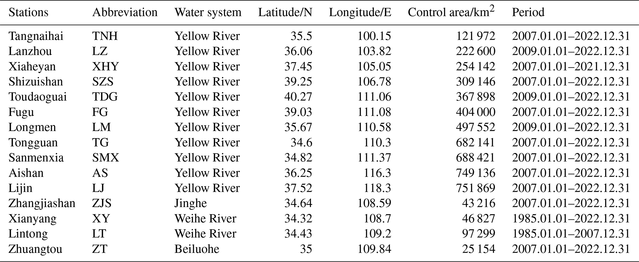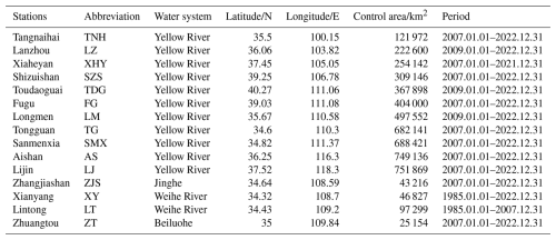 The research area of this study (Fig. 1) is the Yellow River Basin in China, which has a main stream length of approximately 5464 km and a catchment area of about 795 000 km2, ranking second in China and fifth in the world. The Yellow River originates from the Bayan Har Mountains in Qinghai Province, Western China, and flows through 9 provinces before emptying into the Bohai Sea. This study utilizes daily streamflow records from 15 hydrological stations in the Yellow River Basin. These stations are selected based on rigorous criteria to ensure statistical robustness: (i) a minimum continuous record length of 10 years; (ii) a data completeness requirement of 100 %, with zero missing daily values throughout the selected study period to ensure continuous time-series modeling; and (iii) spatial representativeness covering the upper, middle, and lower reaches of the basin. These stations (Fig. 1) include those located on the mainstream (Tangnaihai (TNH), Lanzhou (LZ), Xiaheyan (XHY), Shizuishan (SZS), Toudaoguai (TDG), Fugu (FG), Longmen (LM), Tongguan (TG), Sanmenxia (SMX), Aishan (AS), and Lijin (LJ)) and the largest tributary Weihe River Basin (Zhangjiashan (ZJS), Xianyang (XY), Lintong (LT), and Zhuangtou (ZT)).