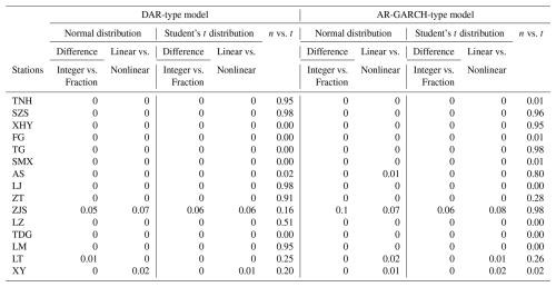 Dimitriadis and Koutsoyiannis (2015) demonstrated that long-term persistence – characterized by the temporal dependence between historical and contemporary streamflow – is fundamental to daily streamflow prediction. And it has been reported that time-varying volatility detected in daily streamflow series could be attributed to long-term memory (Dimitriadis et al., 2021; Graves et al., 2017; Grimaldi, 2004), which may lead to a spurious ARCH effect in residuals of the pure AR model, rendering the constructed GARCH model insufficient and affecting prediction performance. Both the combined AR-GARCH model and the novel DAR model are powerless to reproduce the long-term persistence of the daily streamflow time series. Long-term memory was always neglected in the vast majority of existing streamflow simulation and prediction studies. The research on long memory began with Hurst (1951) and Mandelbrot and Wallis (1969), and Hurst proposed the Hurst index (H, H>0.5 indicates that the time series has long memory) to identify it. Although this characteristic was initially identified within the field of hydrology, at that time, there lacked a research methodology widely recognized by most hydrologists that could effectively reproduce the long-term memory of daily streamflow. Granger (1978) proposed the concept of “fractionally differencing”, which laid the foundation for the development of later long-memory models (such as the ARFIMA model). Hosking (1981) followed up in the field of hydrology. Montanari et al. (1996, 1997) still believed that the fractional difference model is the only method to describe the daily streamflow time series with long-term persistence.