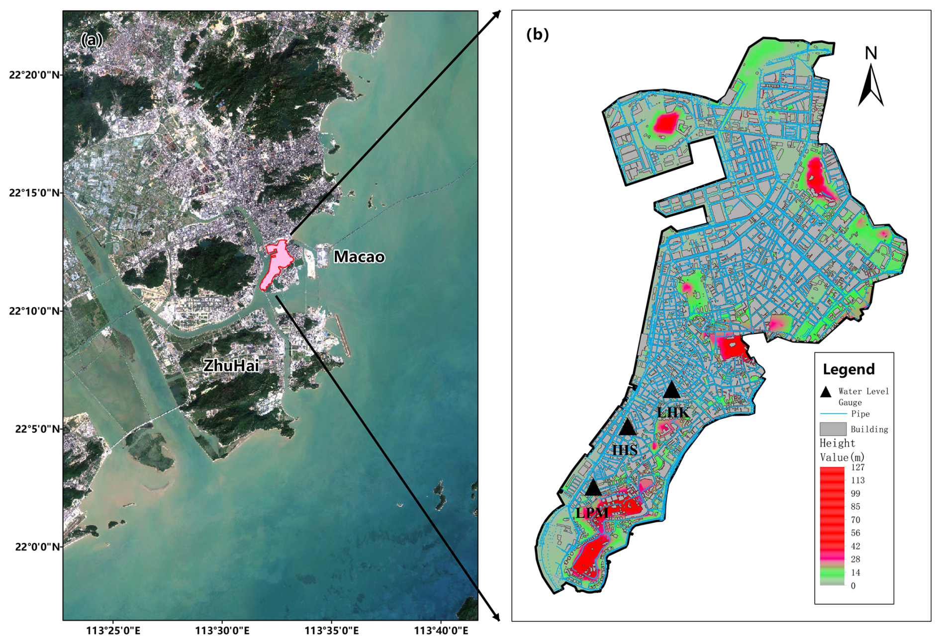Digital Elevation Model (DEM) data, with a spatial resolution of 2 m, along with the drainage network (Fig. 1) and the building distribution information, were obtained from the Macao Cartography and Cadastre Bureau. The elevations in the DEM at building sites increased by 5 m to account for the impediment effect of buildings on surface water flow. All data were verified on the basis of satellite imagery and field investigation. The DEM, drainage network, and building distribution data were first compared with high-resolution satellite imagery to ensure accuracy. For areas where the satellite imagery was unclear, field surveys were conducted to validate the data on-site and address any discrepancies.