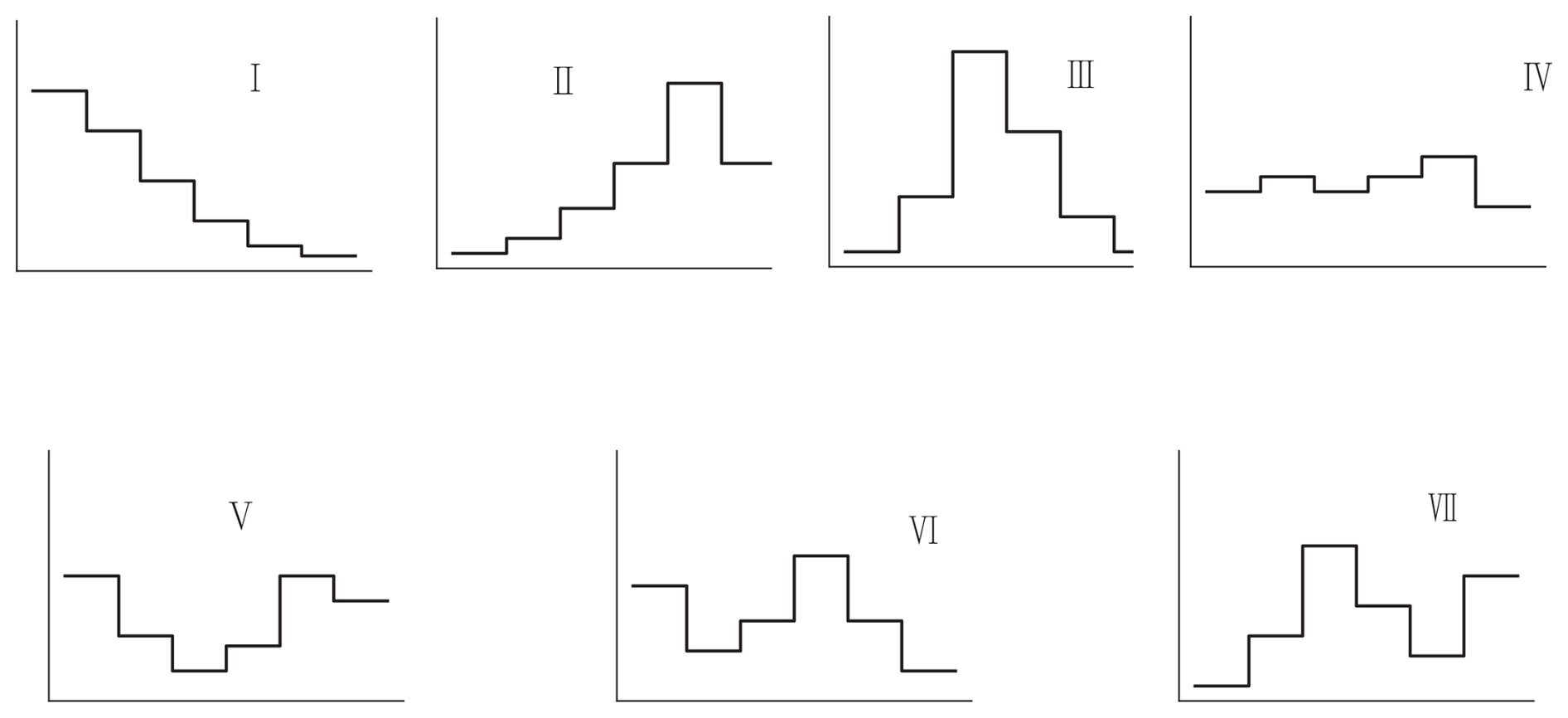 Figure 2Seven typical rainfall patterns. The horizontal axis represents time, and the vertical axis represents rainfall intensity.