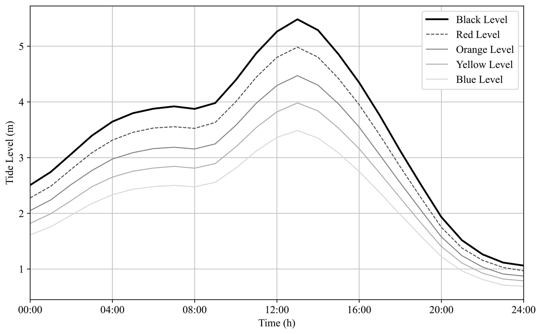 Macao Peninsula is frequently affected by storm surges. Due to the low-lying topography, storm surges negatively impact the drainage capacity of the study area, thereby exacerbating flooding events when they coincide with heavy rainfall. Consequently, it is imperative to incorporate the tidal process in the analysis of flooding within the study area. In this study, the designed tidal process lines of 5 warning levels derived by Zhang et al. (2024) were used. The designed tidal process lines are shown in Fig. 3.