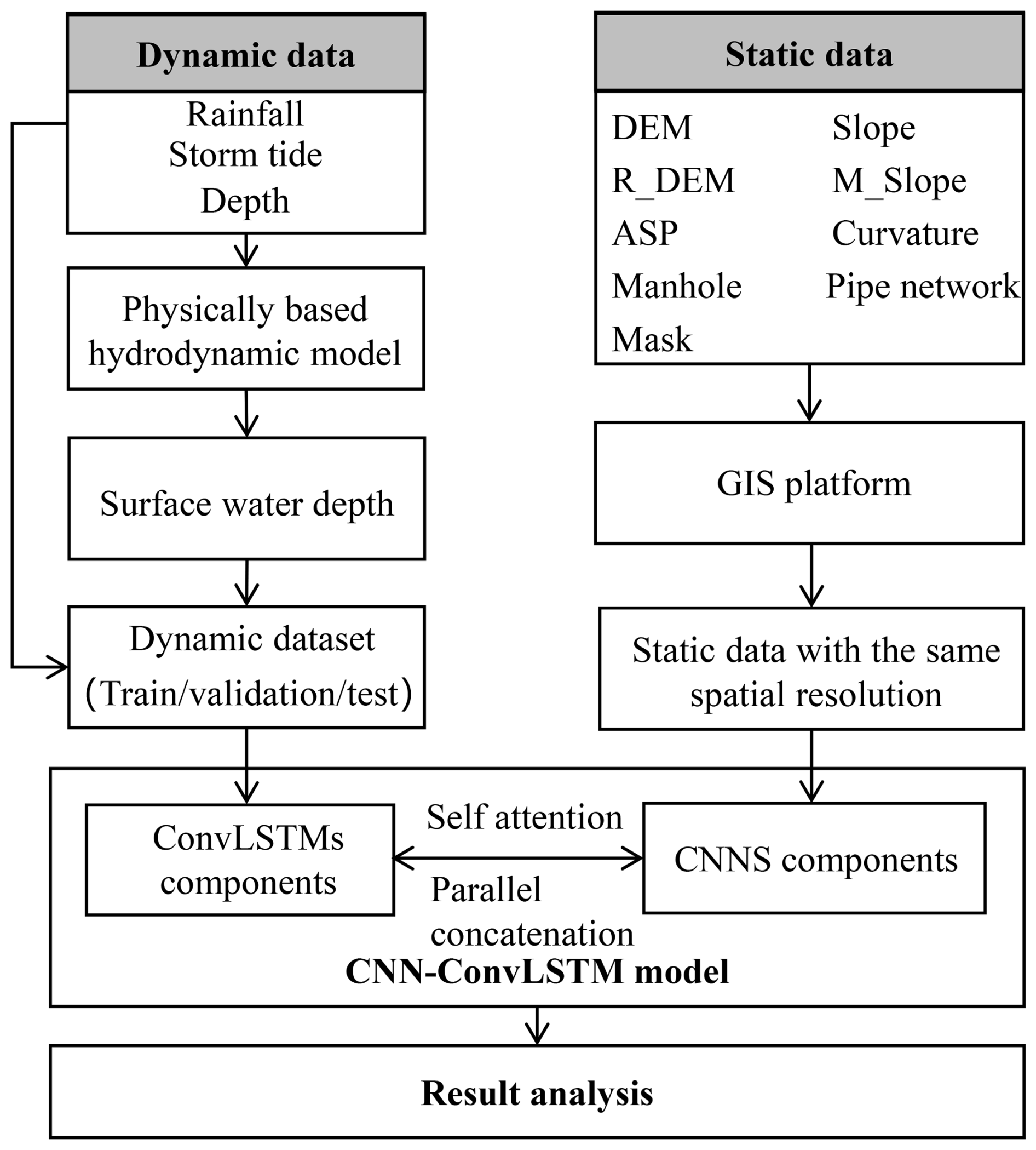 Figure 4Data flow and workflow of the CNN–ConvLSTM framework. Dynamic data (rainfall, storm tide, simulated water depth) and static data (DEM and terrain features) are preprocessed and integrated into the model through ConvLSTM and CNN branches, respectively. The fused network predicts surface water depth for further analysis.