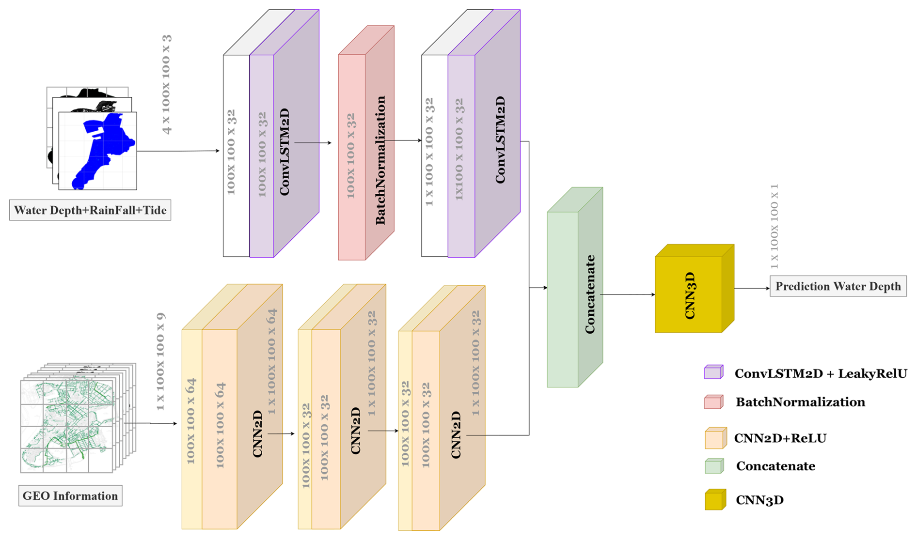 The structure of the CNN-ConvLSTM coupled model is shown in Fig. 5. The model has two components, including the ConvLSTM-based component and the CNN-based component. The ConvLSTM-based component employs an encoder-decoder architecture. The encoder consists of a single ConvLSTM2D layer with 32 convolutional kernels (3 × 3) and LeakyReLU activation, yielding a 100 × 100 × 32 spatiotemporal feature tensor. The decoder mirrors the encoder's structure to reconstruct spatiotemporal dependencies. A batch normalization layer is incorporated between the encoder and the decoder to accelerate the convergence of the model by stabilizing the propagation of the gradient. The input of the ConvLSTM-based component is a temporal sequence comprising rainfall, tidal level, and depth of inundation in four continuous time intervals, structured as a 4 × 100 × 100 × 3 tensor (timesteps × height × width × channels). The CNN-based component comprises three 2D convolutional layers. The initial layer employs 64 kernels (3 × 3) to extract primary spatial features, while the subsequent two layers utilize 32 kernels (3 × 3) each to compress channels and enhance discriminative power through hierarchical feature refinement. The CNN module processes a single-sample input tensor of dimensions 1 × 100 × 100 × 9, comprising nine categories of geographic information data (e.g., digital elevation models [DEM], drainage networks), and generates an output tensor of size 1 × 100 × 100 × 32, which maintains spatial alignment with the ConvLSTM branch for subsequent feature fusion. The outputs of the two branches are merged by a concatenation operation, forming a fused tensor of dimensions 1 × 100 × 100 × 64. Finally, a 3D convolutional layer employing 3 × 3 × 3 kernels compresses the channel dimension to generate the water depth prediction map (1 × 100 × 100 × 1).