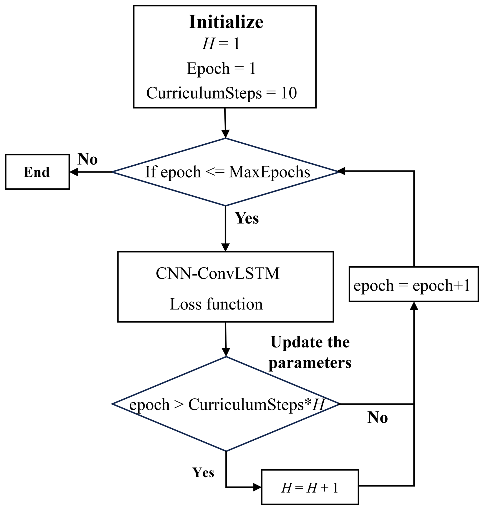 Figure 6Workflow of curriculum learning strategy. The workflow includes initialization, progressive training stages across epochs, and parameter updates designed to improve convergence and predictive stability.