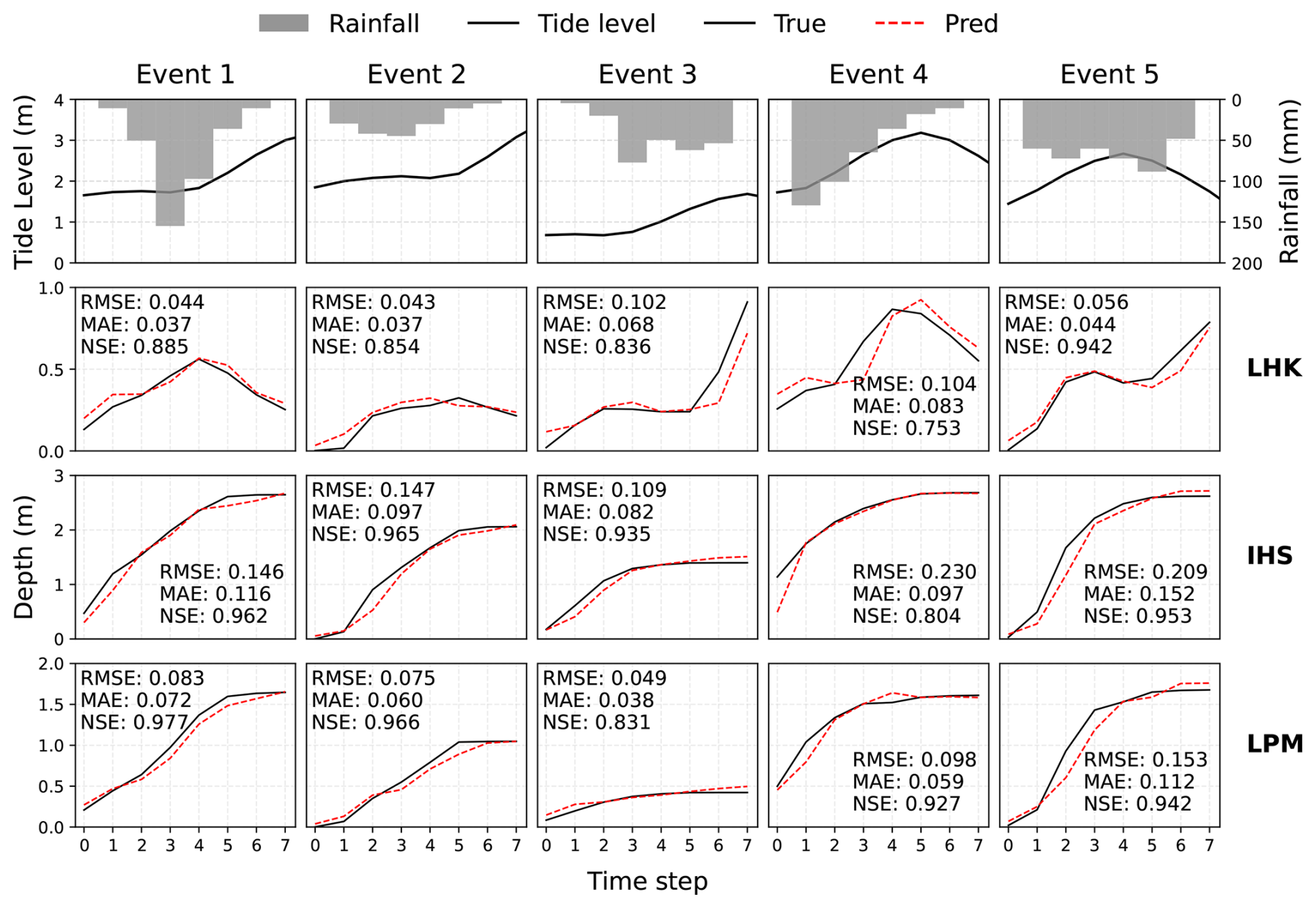 Figure 8Observed and predicted water depth processes at three flood-prone locations (LHK, IHS, and LPM) during five rainfall events. Tide level and rainfall are shown in the top row, followed by time series of observed and predicted water depths at each site. Model performance for each event is quantified using RMSE (m), MAE (m), and NSE.