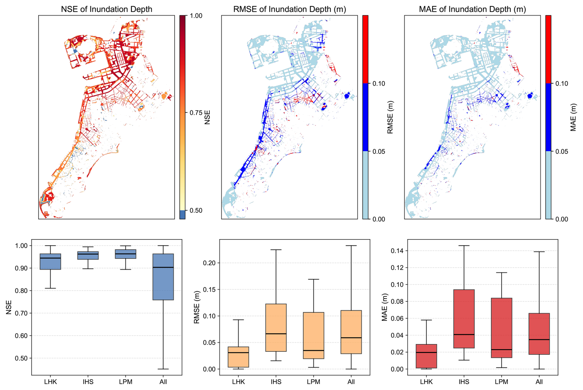 Figure 9Spatial distribution (top row) and station-based boxplots (bottom row) of the evaluation metrics for inundation water depth. The first row shows the spatial distribution of the mean NSE, RMSE, and MAE across all rainfall events, while the second row presents the boxplots at three representative locations (LHK, IHS, and LPM) and for all grids within the study area. Blank areas on the maps indicate regions with no water depth (depth < 0.20 m), which were excluded from evaluation.