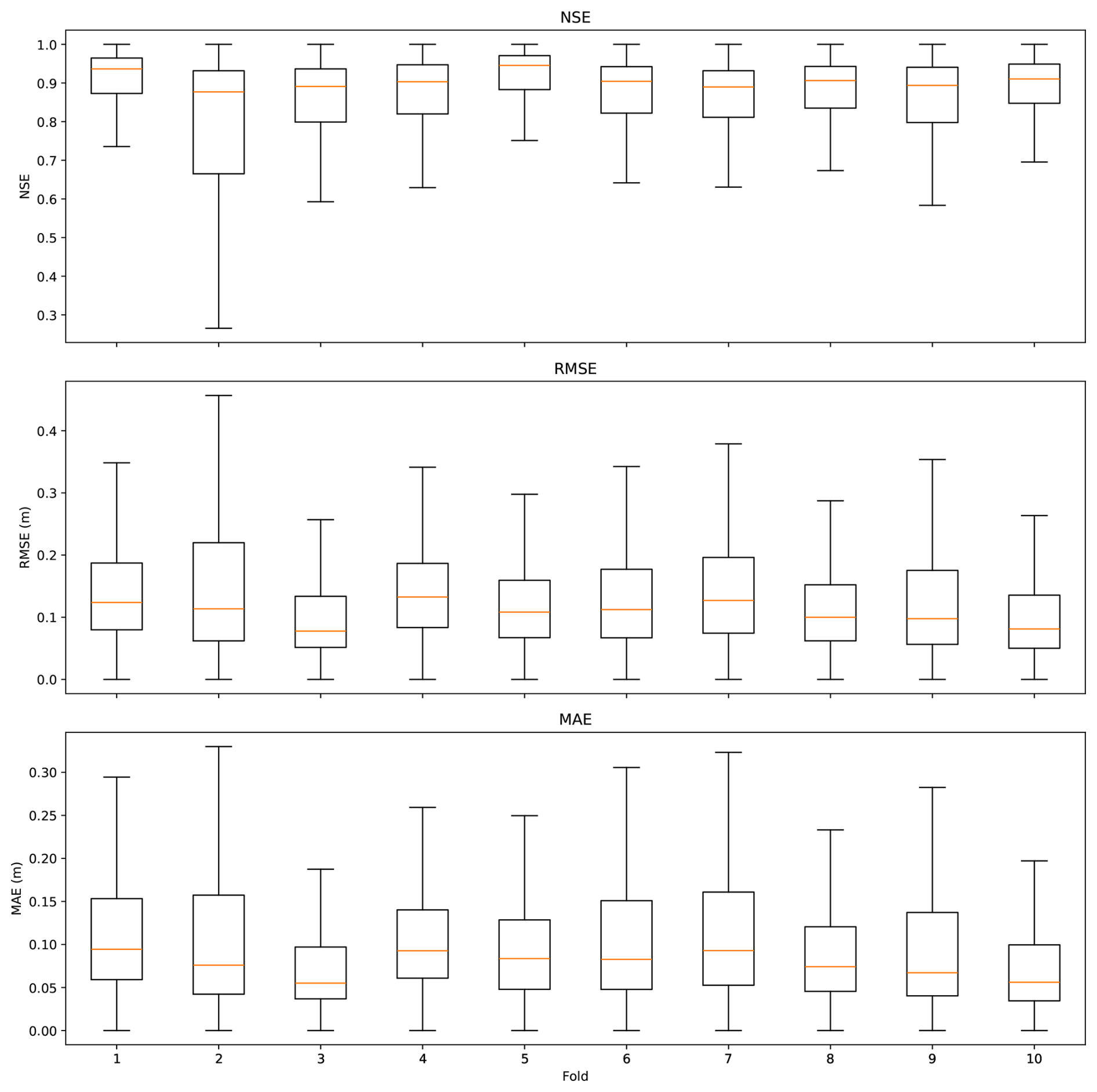 The robustness of the proposed hybrid model was evaluated using k-fold event-level cross-validation. All rainfall–tide combination events were divided into ten subsets. In each iteration, nine subsets were used for training and one for validation, rotating sequentially until all subsets had served as the validation set once. Figure 11 presents the boxplots of NSE, RMSE, and MAE obtained from k-fold cross-validation across ten folds. The performance metrics exhibit consistent distributions among different folds, indicating that the model maintains stable predictive accuracy under varying training–validation splits. Specifically, NSE values remain predominantly high (generally above 0.8) with limited interquartile variability, while RMSE and MAE values stay low and comparable across folds. The median NSE values for all folds exceed 0.8, with most lying around 0.88–0.95. The first and third quartiles of NSE are typically within approximately 0.82–0.96, indicating a narrow interquartile range and consistently strong performance across samples. Correspondingly, the median RMSE values are generally below 0.15 m, with interquartile ranges mostly within about 0.07–0.18 m, while the median MAE values are mostly below 0.10 m, with interquartile ranges approximately between 0.05 and 0.15 m. Although slight differences are observed in a few folds, no systematic degradation or instability is evident. The relatively narrow interquartile ranges and similar median values across folds suggest that the model performance is not strongly dependent on a particular subset of training data. This consistency demonstrates that the proposed model generalizes well across heterogeneous samples and is not sensitive to data partitioning. Overall, the cross-validation results confirm the robustness and reliability of the model when trained on different subsets of the dataset.