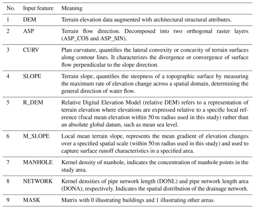 According to the research of Gao et al. (2024), DEM, ASP, CURV, SLOPE, R_DEM, M_SLOPE, TWI, MANHOLE, and NETWORK are sensitive to urban inundation depths and were selected as static input features. The definitions of these static features are provided in Table 1. Among these static features, DEM, ASP, R_DEM, CURV, SLOPE, and M_SLOPE serve as indicators of local terrain deformations linked to surface flow convergence. TWI functions as an integrative index that reflects the potential for soil moisture saturation within the study area. Meanwhile, MANHOLE and NETWORK denote the distribution of drainage systems and suggest levels of urbanization to a certain degree. The correlation analysis conducted by Gao et al. (2024) revealed that R_DEM and TWI exhibit stronger correlations with inundation depth. However, since the study area is an urban region where terrain variations are abrupt and highly discontinuous, the TWI is not applicable. Therefore, this indicator was excluded from the set of sensitivity indicators. The more pronounced correlation of R_DEM compared to DEM indicates that pluvial flooding is generally attributed to relative topographic depressions rather than absolute elevation. Furthermore, the selected variables, with the exception of CURV and SLOPE, exhibit no significant multicollinearity. Nevertheless, these two variables represent distinct topographic attributes. CURV reflects the characteristics of the accumulation of regional surface water, while SLOPE refers to the characteristics of regional surface drainage. Consequently, both variables were incorporated into the study. Furthermore, a building mask (MASK) was incorporated into the input features, acknowledging the significant impact of buildings on hydrological flow within urban environments. The analysis of skewness and kurtosis revealed that certain datasets present right-skewed, long-tailed distributions. Therefore, suitable transformations were implemented to mitigate the effects of outliers. The selection of transformation methods was based on skewness, kurtosis, and the occurrence of negative values in the datasets. A square root transformation was applied to DEM, M_SLOPE, MANHOLE, and NETWORK, whereas a cube root transformation was implemented for R_DEM, SLOPE, and CURV. The selected variables were normalized to a range of 0 to 1 to ensure consistent feature scaling, stabilize training, speed up convergence, and enhance model generalization. The static input features can be expressed as