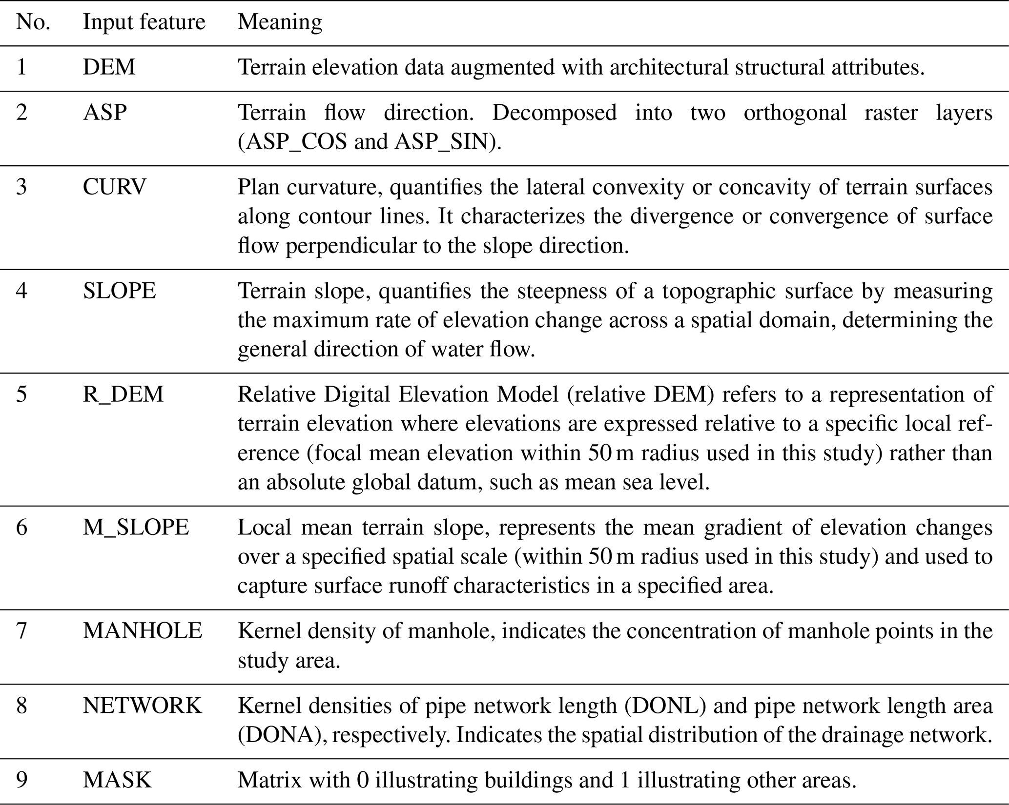 Table 1Definition and Description of Static Input Features which is related to terrain and drainage network characteristics.