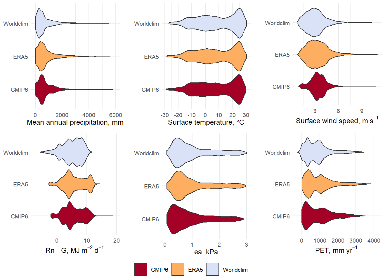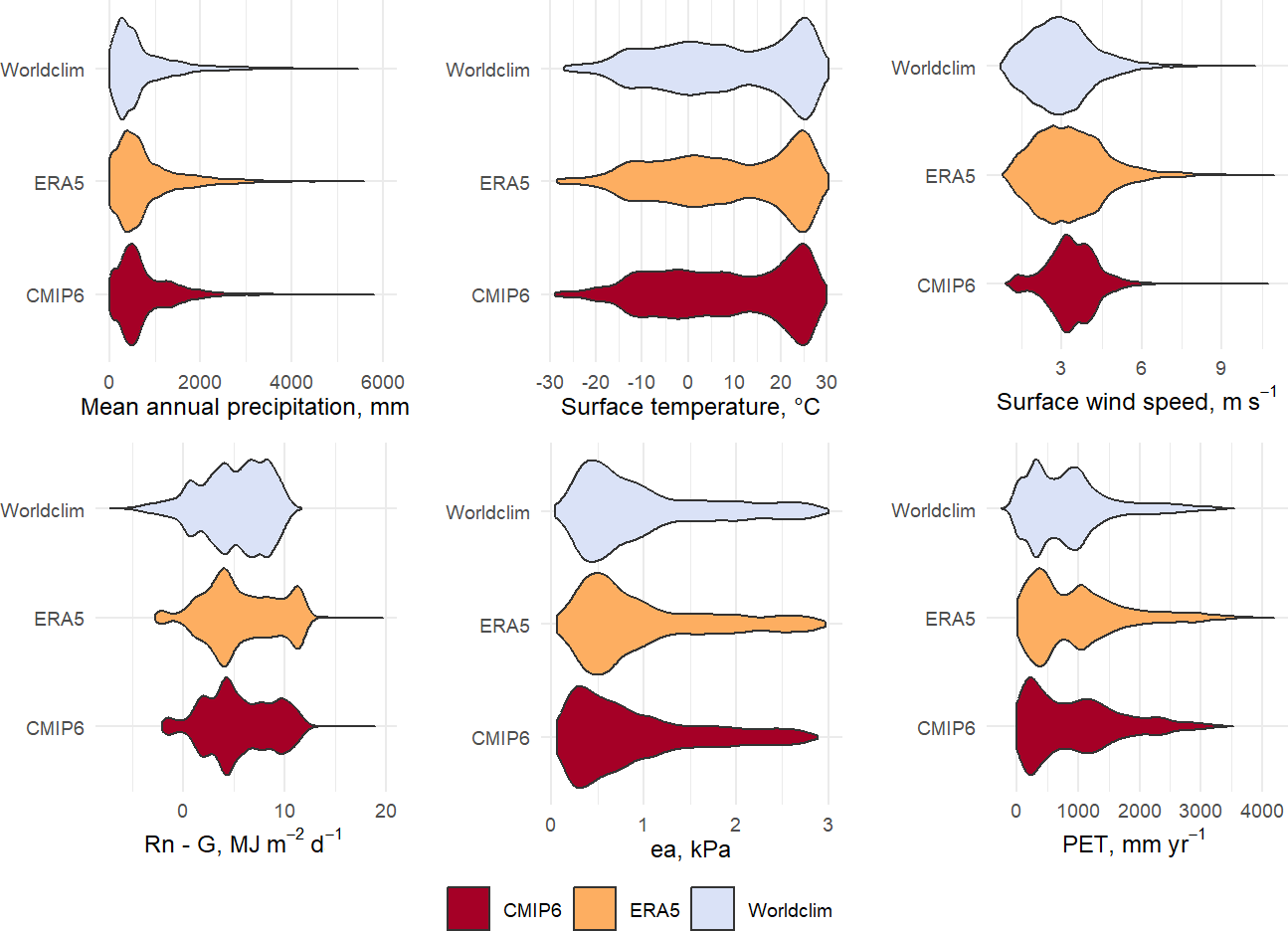 Figure 1Violin plots of the main climate variables in Worldclim, ERA5 and CMIP6. Rn−G represents the net solar radiation minus the soil heat flux, and represents the total heat fluxes at the surface. “ea” is the actual vapor pressure.