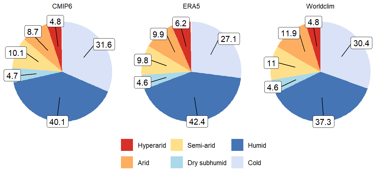 The 30-years average of the aridity index is used to compare ERA5, Worldclim and CMIP6 datasets for the reference period 1970–1999. Figure 2 presents a pie chart showing the percentage of each aridity category for the 3 datasets and for the reference period.
