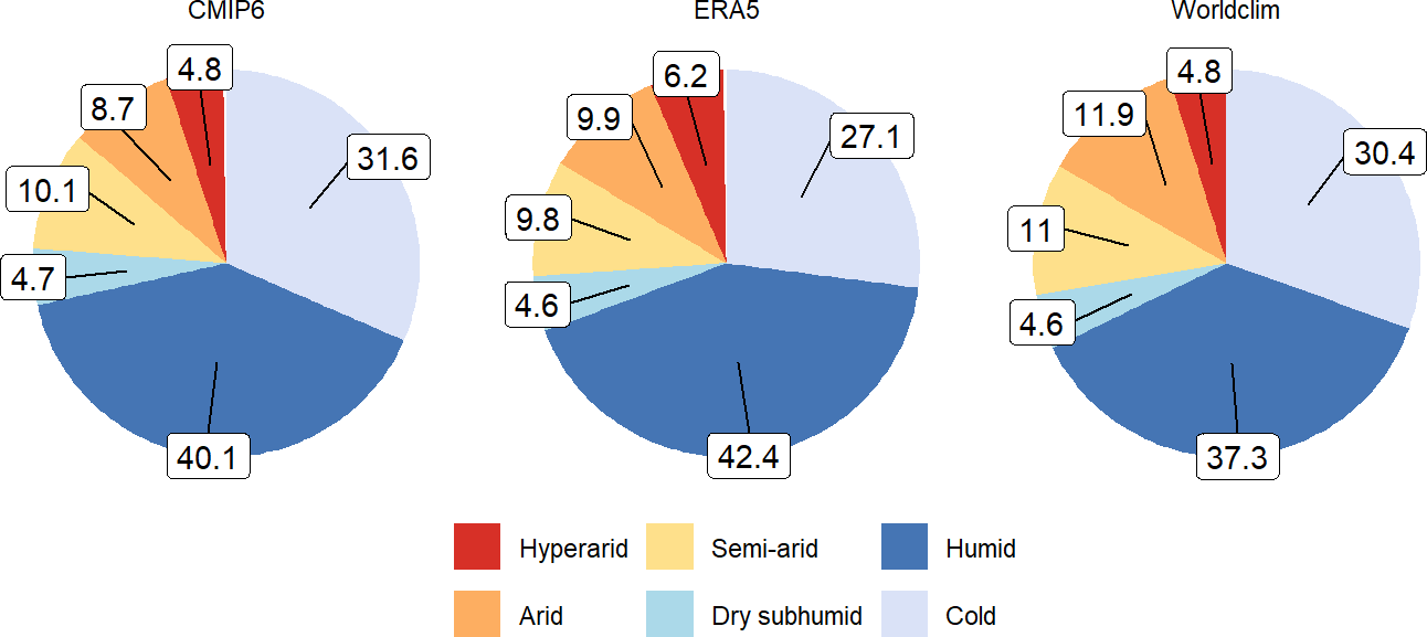 The pie charts highlight the similarities and differences between CMIP6 and the two reference databases. In general, there are less grid cells classified as drylands in CMIP6 (28.3 %) compared to ERA5 (30.4 %) and Worldclim (32.3 %). The proportion of humid grid cells is the highest in ERA5 (42.4 %) compared to CMIP6 (40.1 %) and Worldclim (37.3 %). CMIP6 has the highest share of cold grid cells (31.6 %). This share decreases to 27.1 % in ERA5 and 30.4 % in Worldclim.