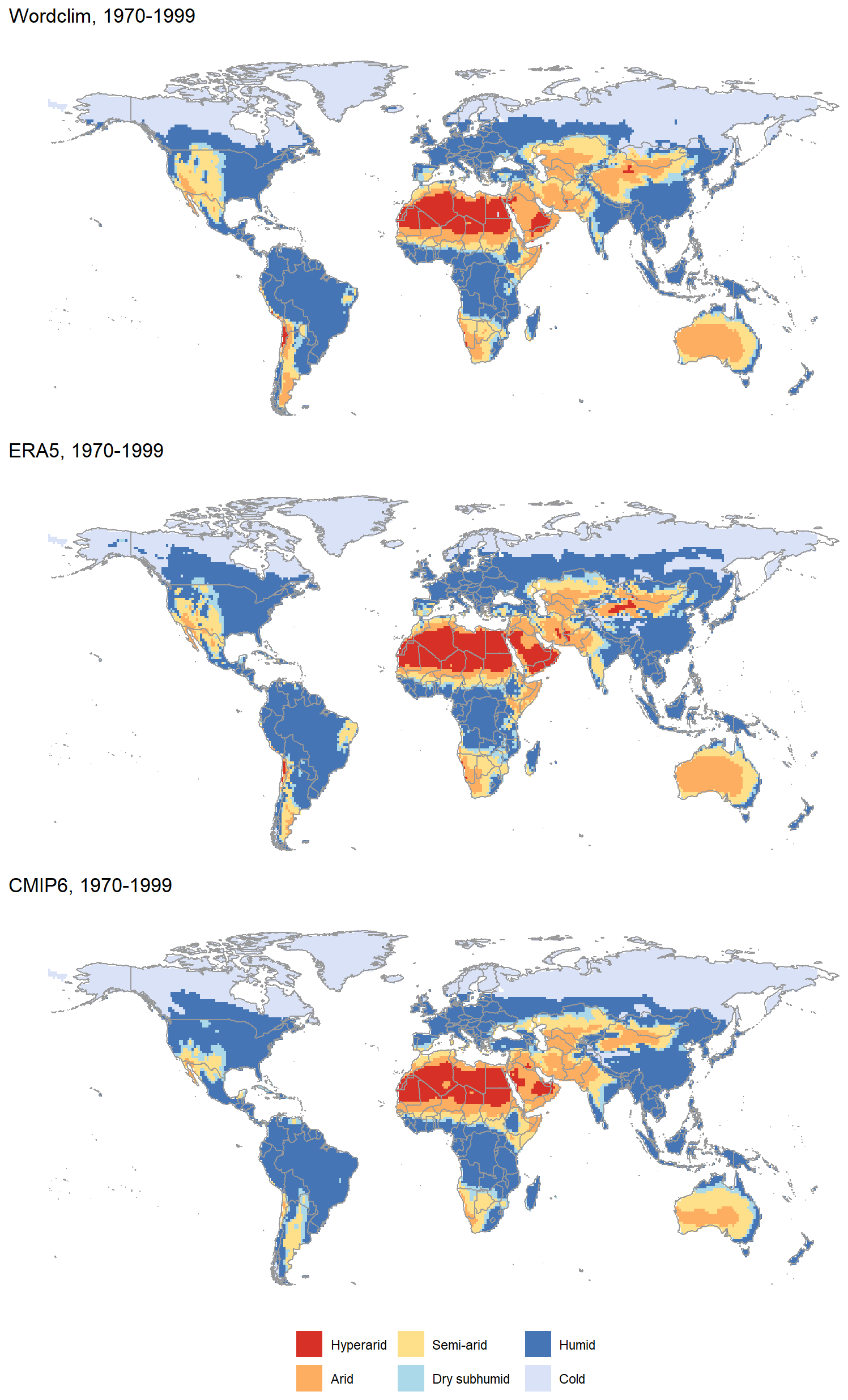 Regional differences in the distribution of aridity categories are visible on Fig. 3. Overall, the CMIP6 multimodel categories matches the patterns found in ERA5 and Worldclim. However, several deserts appear in CMIP6 as semi-arid or even dry subhumid areas, whereas they are clearly arid or hyperarid in Worldclim and ERA5.