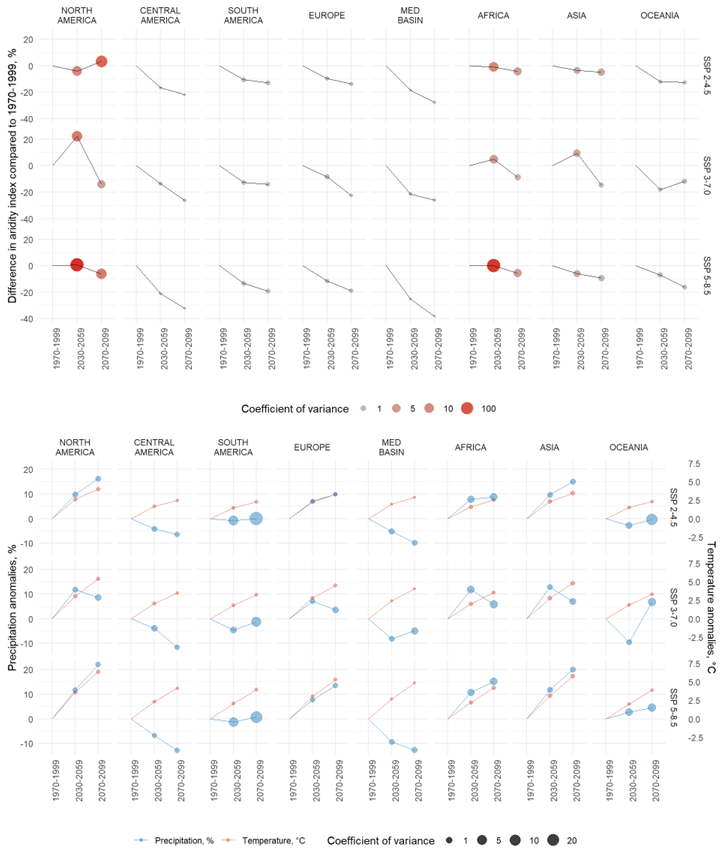 This is particularly visible for Central and South America, the Mediterranean region and Oceania, in SSP 2–4.5 and 5–8.5. In these regions, the changes in aridity index are driven by the conjunction of increasing average temperatures and decreasing average precipitation. In SSP 3–7.0, the average aridity index in Oceania decreases down to −20 % in the near future and increases in the far future.