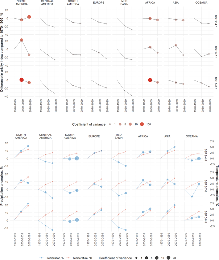 North America is the continent with the highest model dispersion in aridity index, with standard deviation exceeding 100 % of the average value. In SSP 2–4.5, the aridity index slightly decreases in the short term, before increasing again in the long term. In SSP 5–8.5, the average aridity index does not change in the near future, but decreases in the long term. In SSP 3–7.0, the drastic increase in aridity index (> +20 %), indicating wetter conditions, is followed by a strong decrease (−15 %) in the long term. This responds to the strong wetting of northern part of the continent in the period 2030–2059, followed by the drying of most of the continent in 2070–2099. In SSP 2–4.5 and 5–8.5, both temperature and precipitation increase steadily, up to an average of +7.5 °C in 2070–2099 for SSP 5–8.5 and a 20 % average increase in precipitation over the same period. This is again driven by the northern part of the continent, which experiences the most drastic changes.