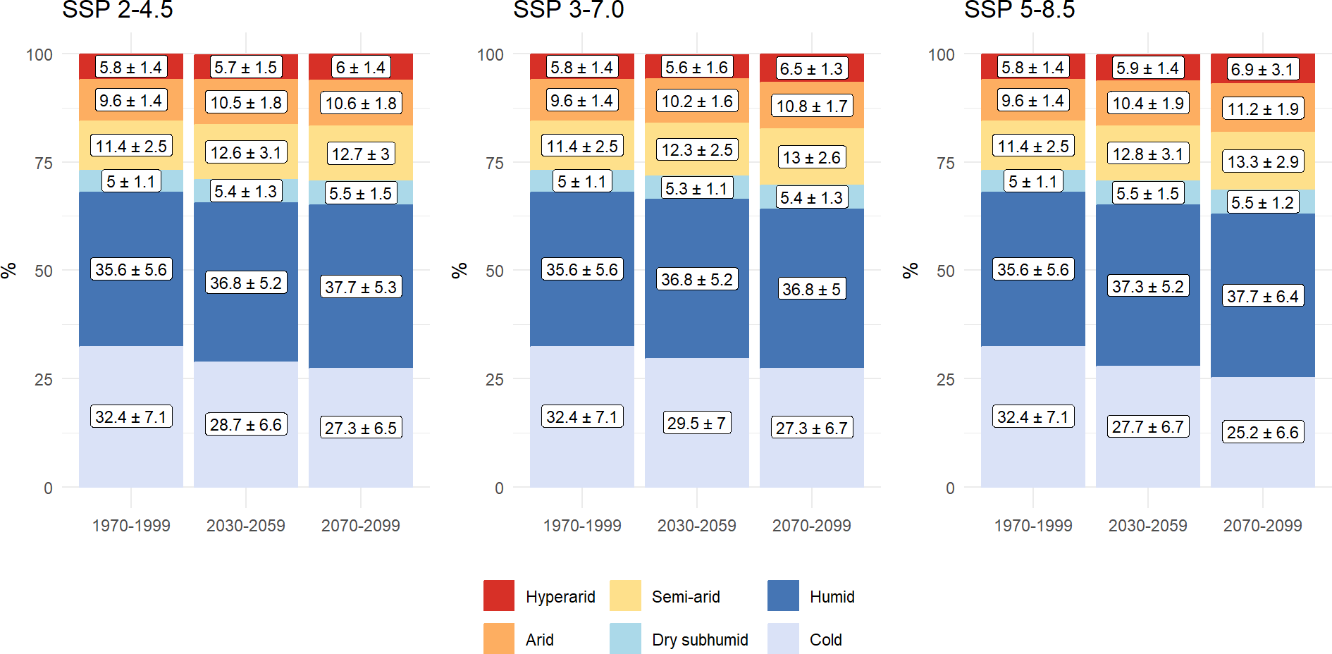 Figure 6Evolution of percentage of aridity categories in the socio-economic pathways SSP 2–4.5, SSP 3–7.0 and SSP 5–8.5. The proportion of each aridity category represents the average of the 13 CMIP6 models, accompanied by the standard deviation.