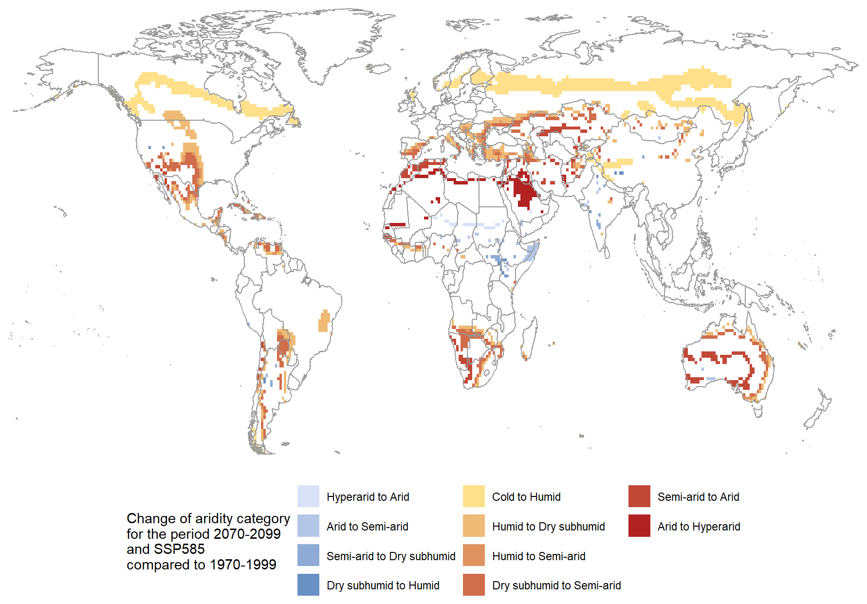 In analysing the changes in aridity index globally it can be seen that significant changes occur even in areas that are considered to be cold or humid. In addition, the change in aridity index sometimes leads to a change in aridity category.