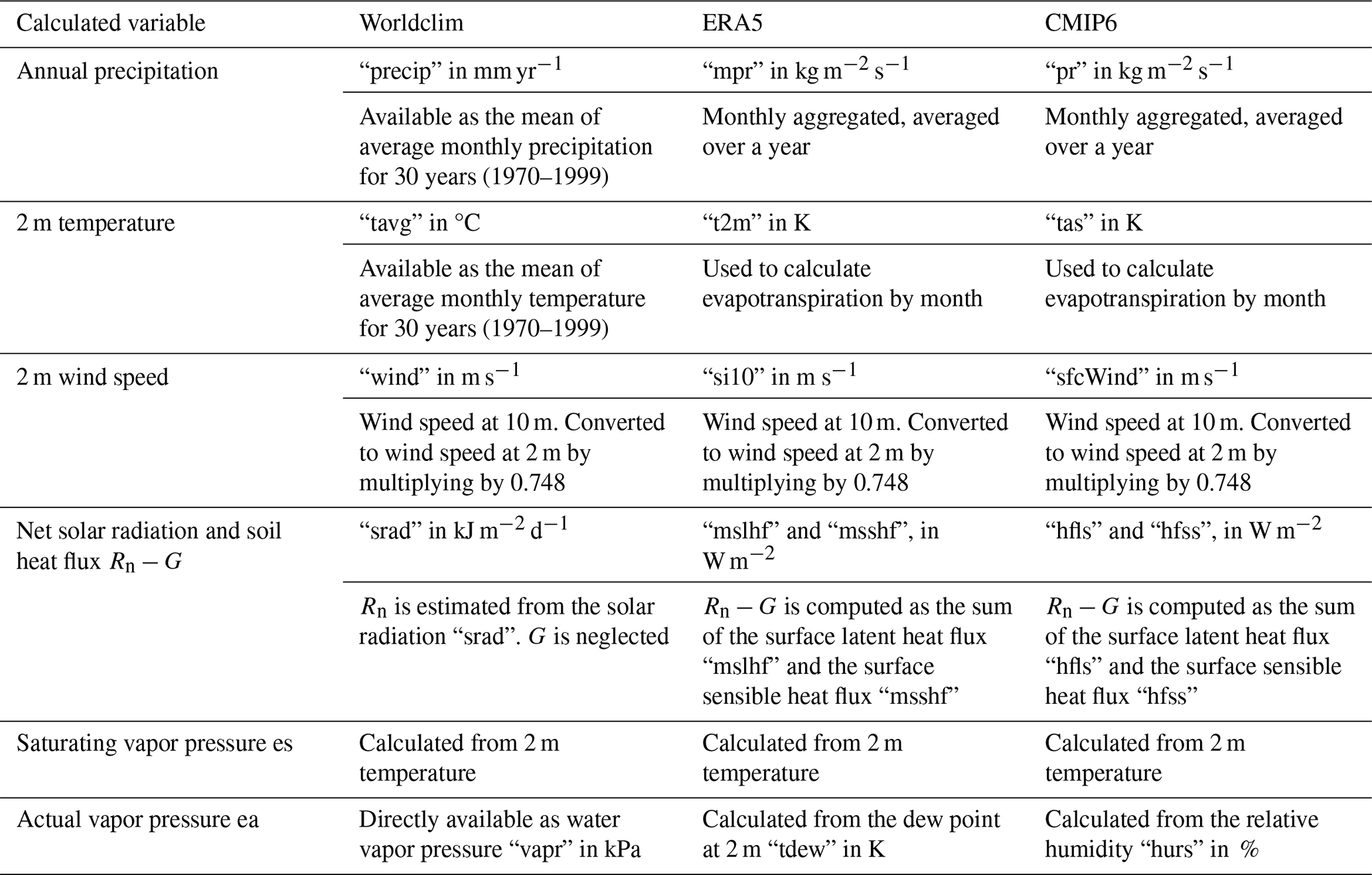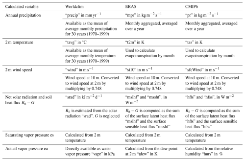 The potential evapotranspiration is calculated based on the variables available in each database. Table 2 summarizes which variable is used to compute each term in the Penman-Monteith equation.