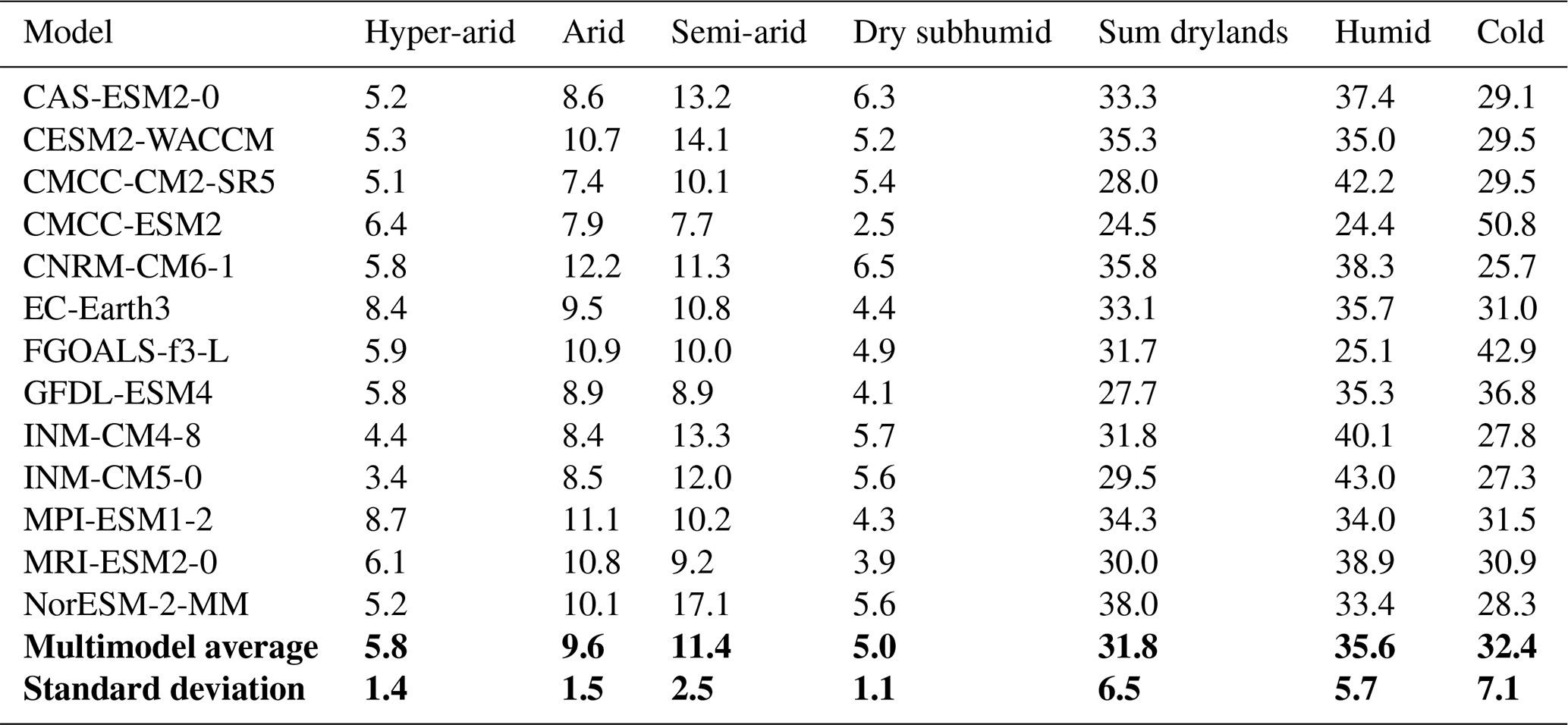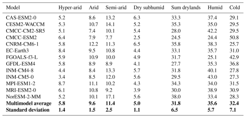 Table 3Percentage of aridity categories for the 13 CMIP6 models and multimodel average percentage of aridity categories for the reference period 1970–1999. The multimodel average and corresponding standard deviation from now on refer to the global average, and not the average per grid cell. In italics: min and max values in each category.
