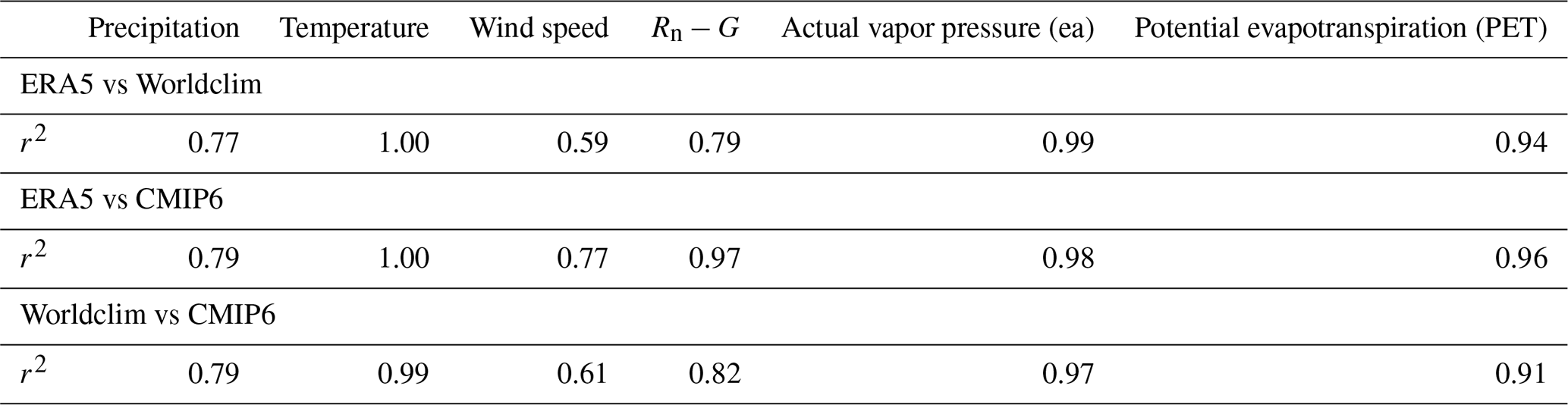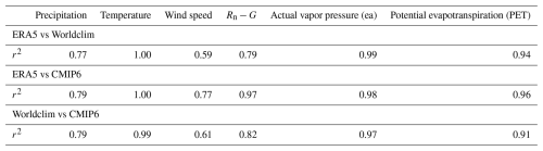 All the variables are well correlated with each other, up to an r2 of 1 for surface temperature for the 3 pairs of databases. The actual vapor pressure in the three databases is also highly correlated (r2 = 1 for ERA5/Worldclim and ERA5/CMIP6, and r2 = 0.99 and Worldclim/CMIP6). The annual precipitation, the wind speed and the solar radiation have a higher spread between databases. The shapes of the violins for precipitation are similar, despite higher values in CMIP6. The correlation coefficients are close to 0.9 (r= 0.88 for ERA5/Worldclim, r= 0.89 for ERA5/CMIP6 and Worldclim/CMIP6). The spread is largest for the wind speed, where ERA5 and CMIP6 are more correlated (r= 0.59 for ERA5/CMIP6, r= 0.77 for ERA5/Worldclim, and r= 0.61 for Worldclim/CMIP6). However, the values of wind speed in CMIP6 are mostly comprised between 3 and 5 m/s, while the range is broader in ERA5 and Worldclim. The solar radiation (Rn−G) is also more correlated between ERA5 and CMIP6 than compared to Worldclim (r= 0.99 for ERA5/CMIP6, while r= 0.89 for ERA5/Worldclim and 0.91 for Worldclim/CMIP6). This is also reflected in the shape of the density, with Worldclim having more negative values than ERA5 and CMIP6, no points higher than 12 MJ m−2 d, and most values being comprised between 5 and 10 MJ m−2 d. This difference is due to the different source for the two variables: in CMIP6 and ERA5, Rn−G is calculated as the sum of the flux of latent and sensible heat fluxes, while in Worldclim this term is derived from the total solar radiation and the latitude.