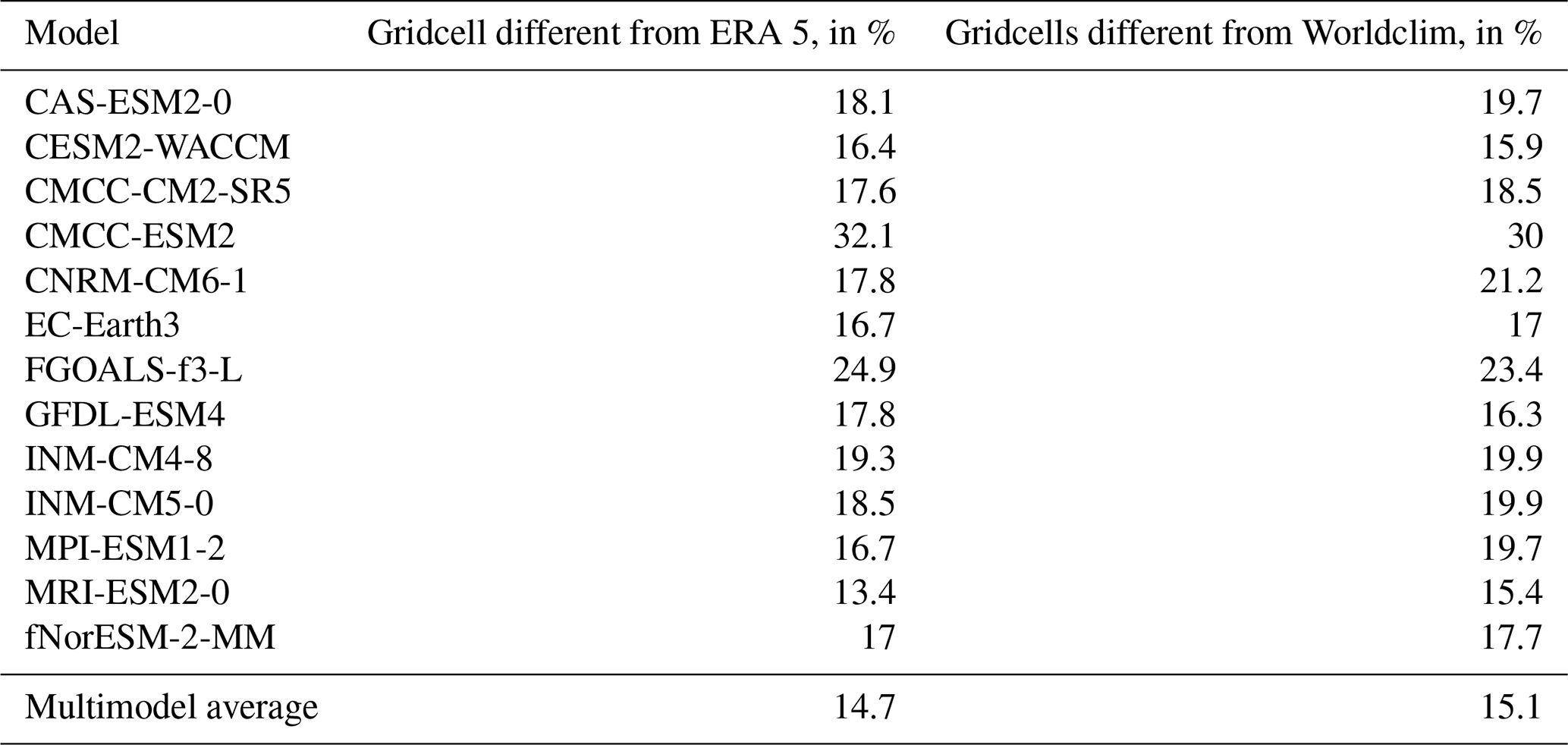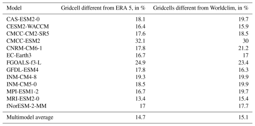 However, globally, the multimodel average performs better than any individual model. Table 5 shows the percent of grid cells classified into different aridity categories for the 13 CMIP6 models compared to Worldclim and ERA5, as well as the multimodel average. The percentage of difference between Worldclim and ERA5 is 13.1 %. This percentage rises to 14.7 % when comparing the multimodel average to ERA5 and to 15.1 % when comparing with Worldclim, which is better than any of the CMIP6 models taken individually.