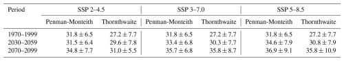 Overall, we find that with the PM equation on our CMIP6 data, the extent of drylands during the reference period is 31.8 %. This extent increased by 3 %, 3.9 % and 5.1 % in SSP 2–4.5, SSP 3–7.0 and SSP 5–8.5, respectively. These trends meet the results presented in the UNCDD report (Vincente-Serrano et al., 2024), with North-America, Latin-America and Europe being the continents most impacted by drying trends. In the report, the initial extent of drylands calculated is higher than in our study (40.6 % of the land area for the reference period 1990–2020), but the projected expansion slightly lower (around 2 % in SSP 2–4.5, less than 3 % in SSP 3–7.0, around 4 % in SSP 5–8.5). To further compare our data with the UNCDD report, we used the Thornthwaite evapotranspiration as a temperature-based method to compute aridity projections with our data. The results are shown in Table 6. We find that the extent of drylands was lower for the reference period with the Thornthwaite equation (27.2 %), but the increase is higher in all SSP compared to the increase calculated with the PM equation: the increase is 3.8 % in SSP 2–4.5, and 8.6 % in both SSP 3–7.0 and 5–8.5.