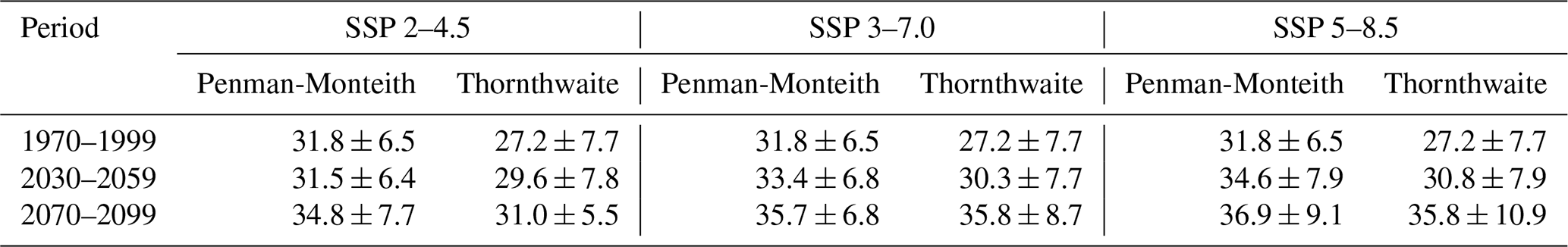 We use the evapotranspiration as defined by Penman-Monteith, that requires the mean annual temperature, actual vapor pressure and surface energy fluxes. 13 CMIP6 models were selected, that offered the 6 necessary variables were readily available for a resolution of 100 km and for the historical period as well as the 3 SSP.