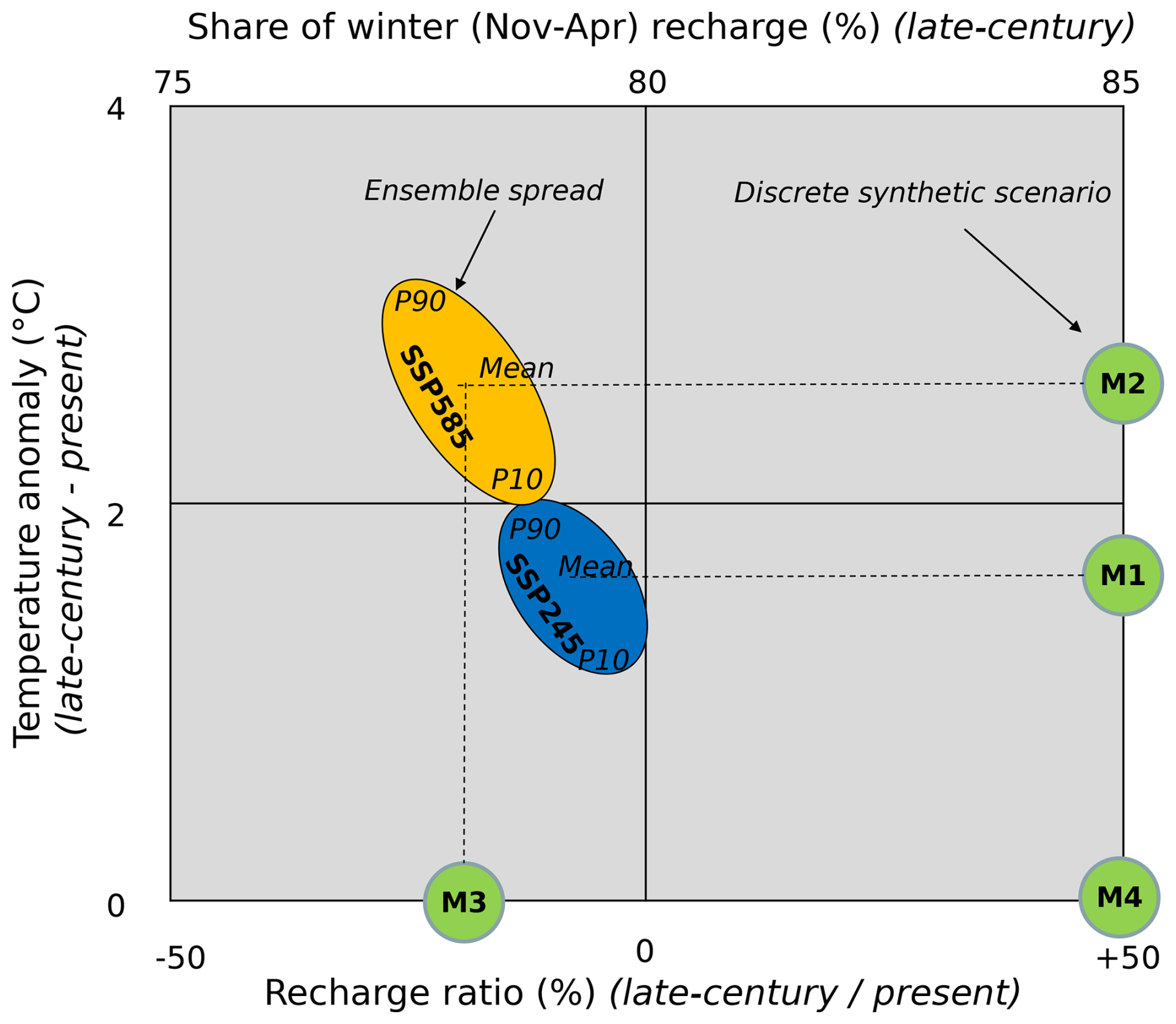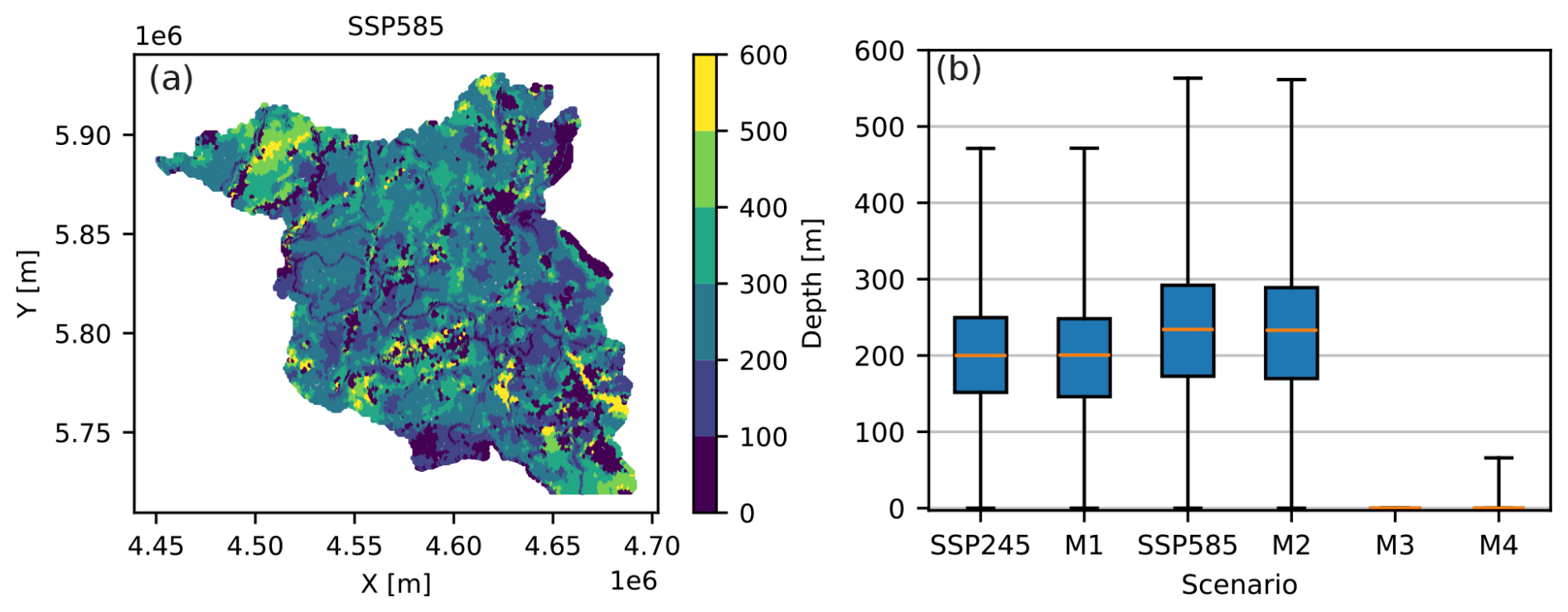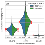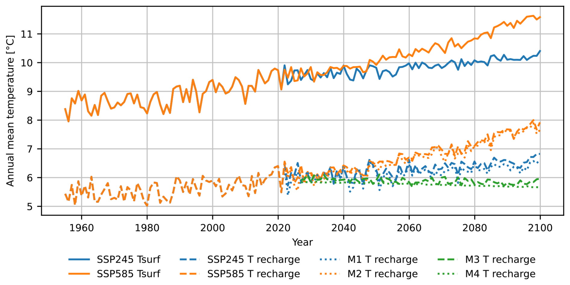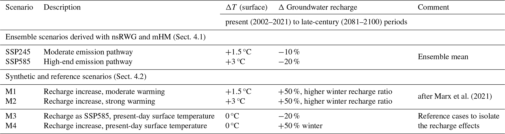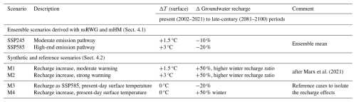 The resulting layout of scenarios for groundwater simulations allows us to compare the difference between two SSPs and a potential impact of diverging recharge trends on the subsurface flow and temperature distribution (Fig. 4).