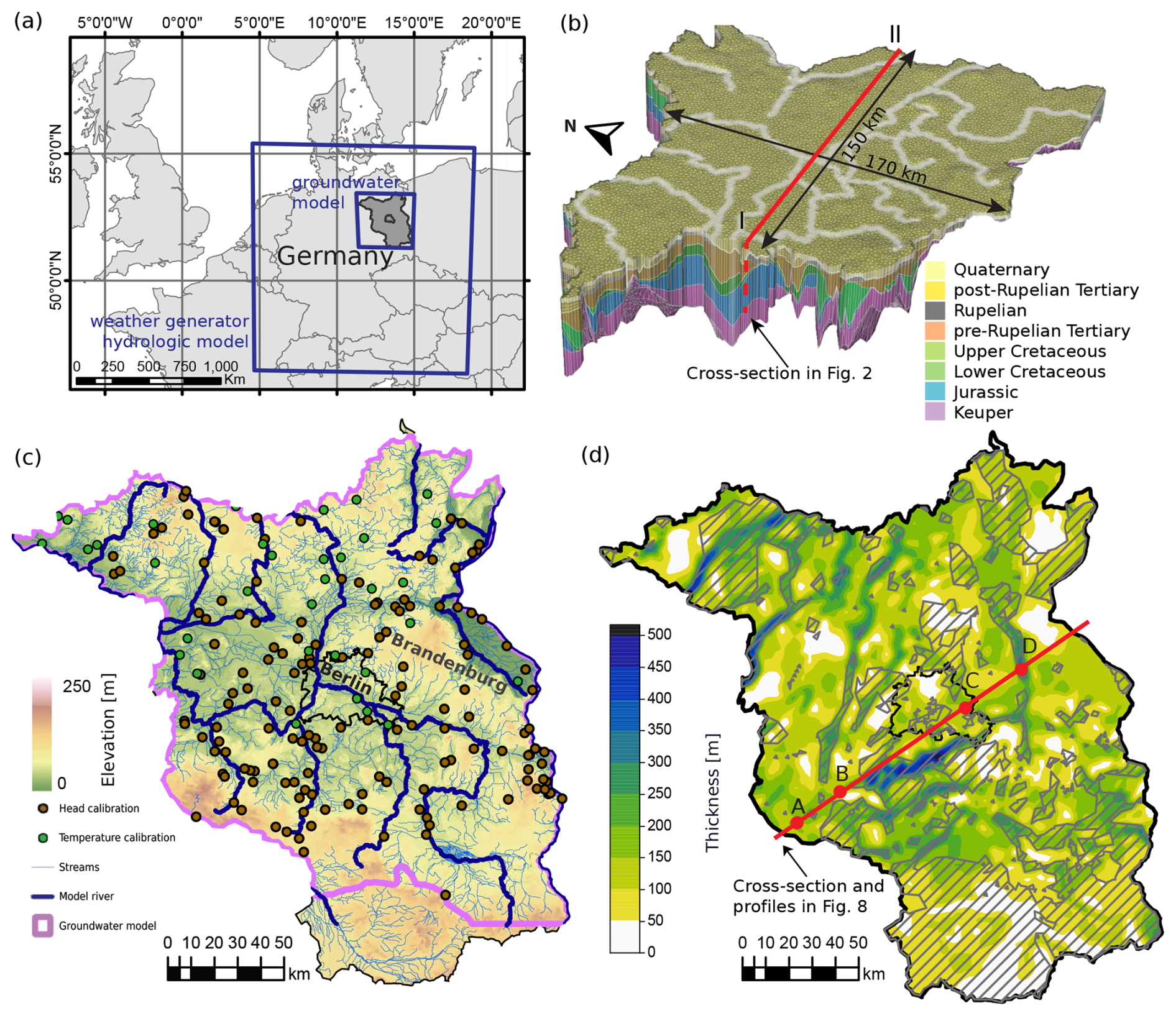 Figure 1Overview of the study area: (a) geographical location and models' extent; (b) 3-D view of the groundwater model mesh; (c) topography of Berlin-Brandenburg and locations of the groundwater model calibration points; (d) thickness of the Quaternary unit. Dashed polygons indicate absence of the Rupelian aquitard.