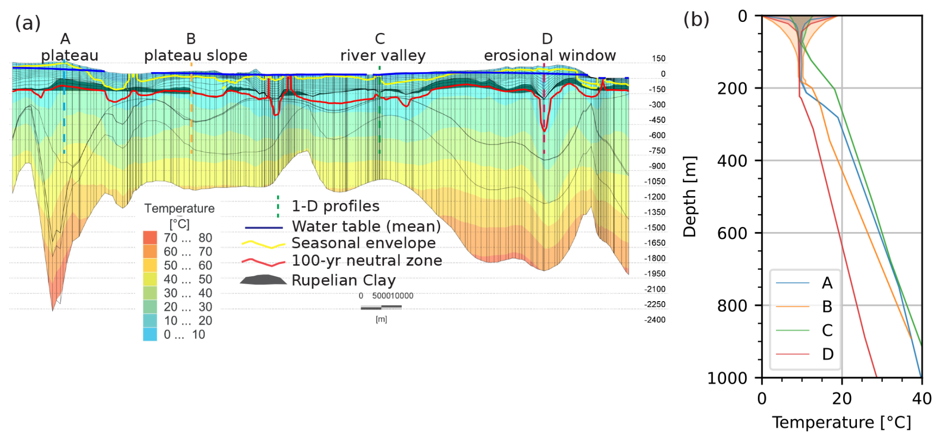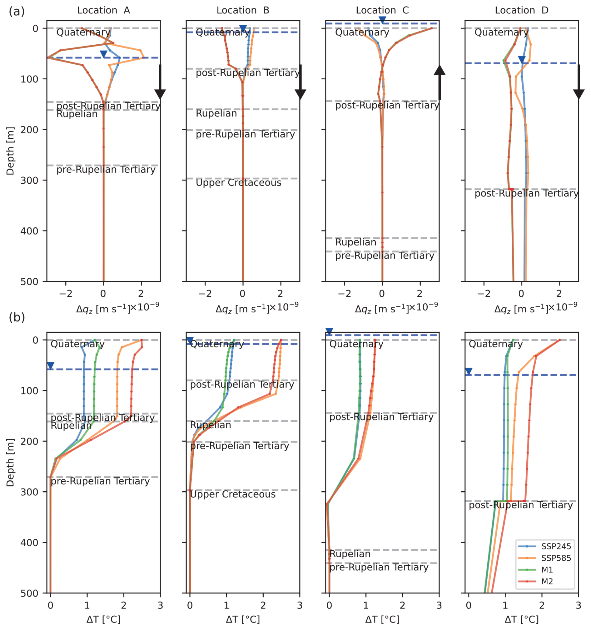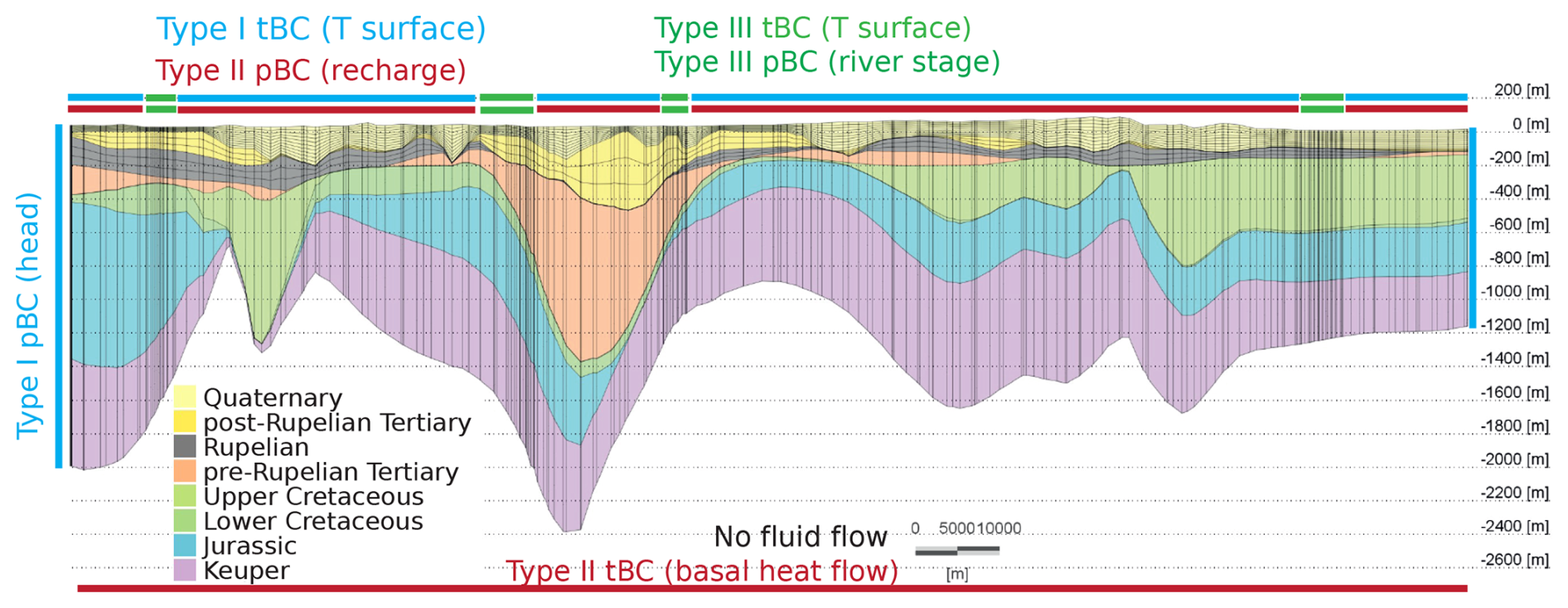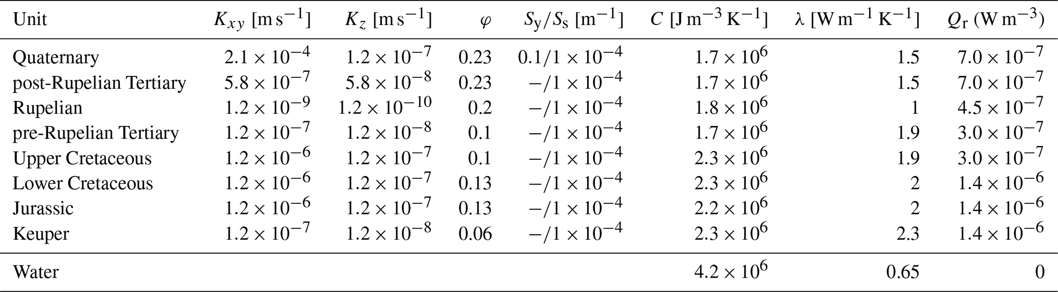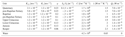 Thermal and hydraulic properties for stratigraphic units were kept identical across scenarios to isolate climatic controls (Table A1) and were taken from previous studies (Scheck and Bayer, 1999; Noack et al., 2013) except for the Quaternary and post-Rupelian Tertiary, whose properties were calibrated, as they are the upper two units directly experiencing the impact of varying boundary conditions.