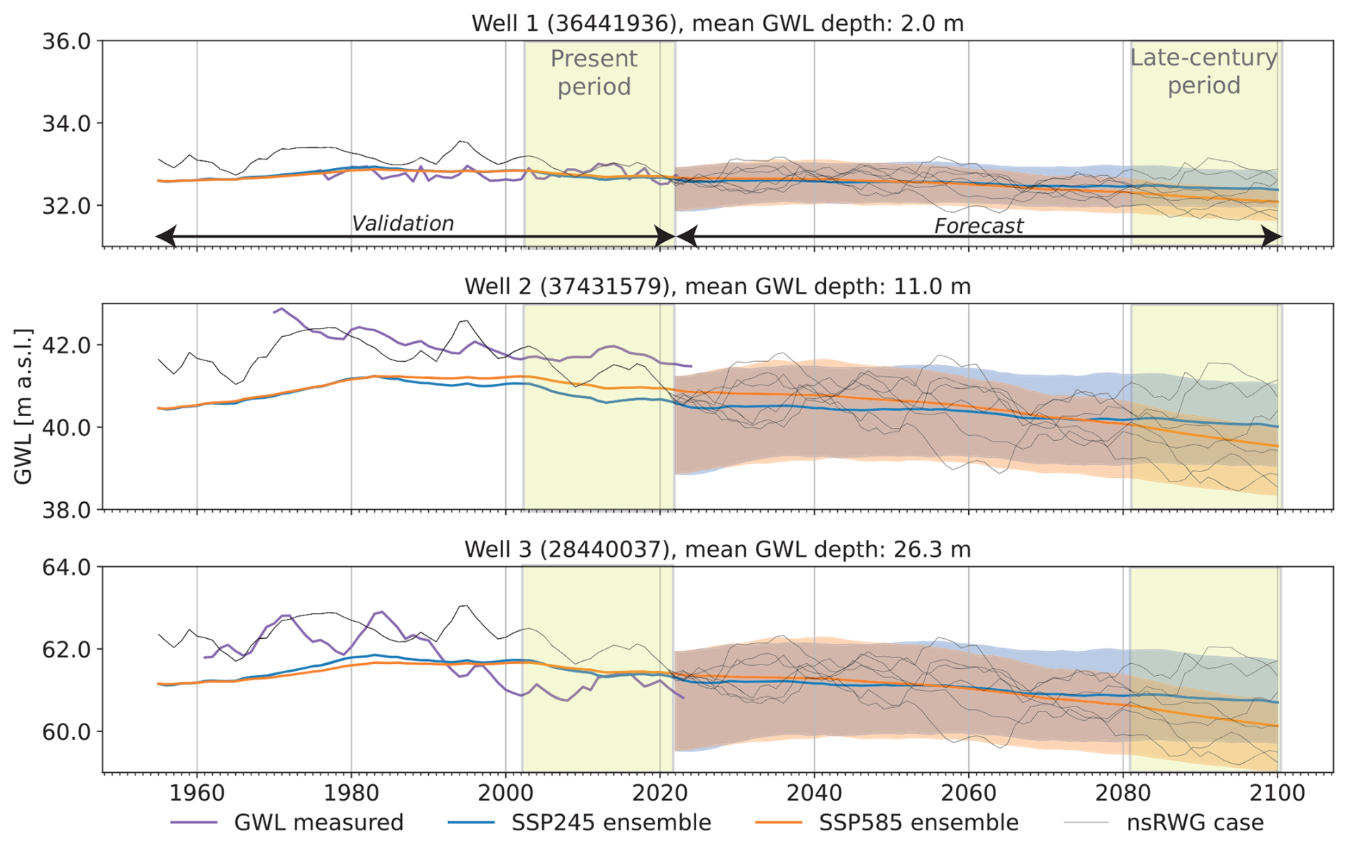 Figure 6GWL time series for (a) shallow, (b) intermediate, and (c) deep monitoring wells (locations shown in Fig. 7a). Colored lines indicate ensemble mean, shaded areas represent P10–P90 range of the ensemble distribution, black lines are examples of individual nsRWG realizations. Numbers in brackets denote well ID from the state monitoring network (LfU, 2023).
