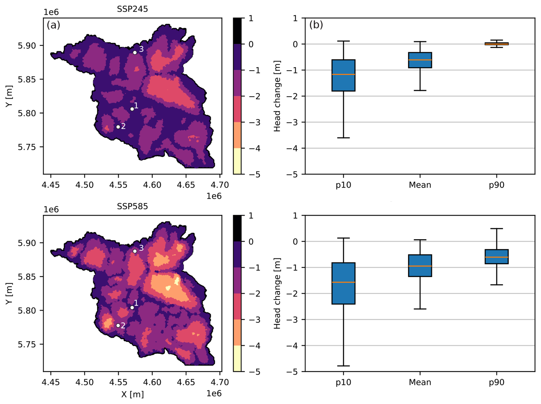 Recharge projections show consistency across GCMs (Figs. 3b, A2). CESM2 tends to give lower recharge in both climate scenarios, while MPI-ESM1-2-HR and IPSL-CM6A provide the largest change only for SSP245 and SSP585, respectively. CNRM-CM6-1 exhibits the smallest change between the reference and the future periods.