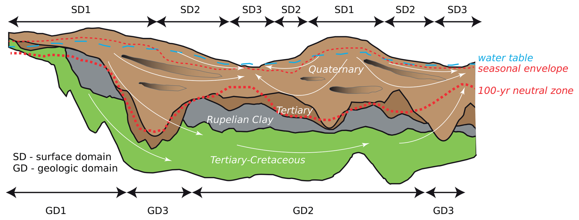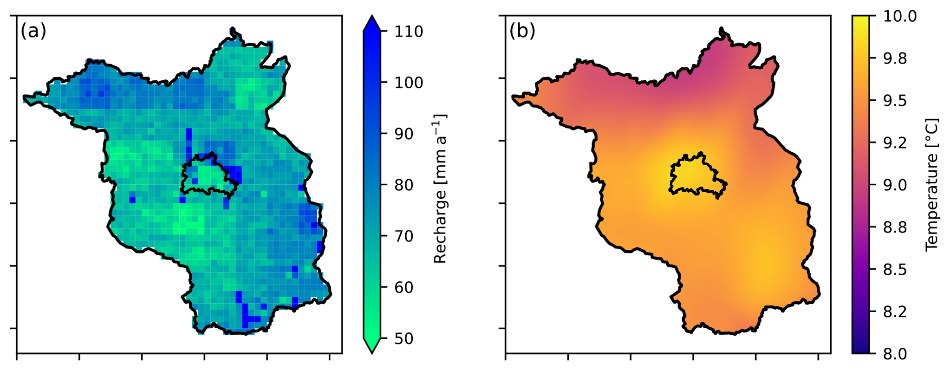 The modification of the conductive geothermal gradient by advection has been used to quantify vertical groundwater fluxes from temperature profiles (Stallman, 1965; Bredehoeft and Papadopulos, 1965; Anderson, 2005; Bense and Kurylyk, 2017; Bense et al., 2017; Kurylyk et al., 2019). Likewise, an inversion of borehole temperature logs may provide information about past land surface temperatures for paleoclimatic studies, though this normally assumes only conductive heat transport (Shen and Beck, 1993). It remains uncertain whether changes in groundwater recharge of up to ±100 mm a−1, projected globally by the end of the century (Reinecke et al., 2021), are sufficient to alter aquifer thermal responses to surface temperature forcing. Stronger but localized evidence of the thermal response to changes in groundwater flux has been found through repeated temperature logging of aquifers subjected to multi-year groundwater abstraction (Bense et al., 2020; Klepikova et al., 2025). A major challenge in assessing recharge effects lies in the influence of preferential flow in the unsaturated zone and the predominance of the lateral flow in the saturated zone due to topographic gradients.