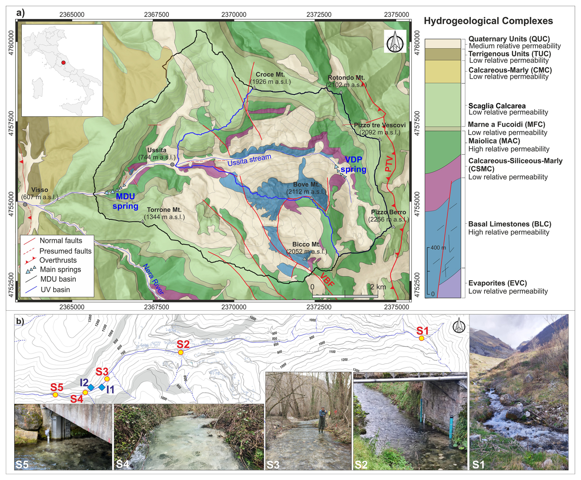The Ussita catchment is situated along the Apennine ridge of Central Italy and is characterized by carbonate multilayer formations belonging to the Umbria-Marche stratigraphic sequence. Figure 1a shows the geological map of the study area with the location of two nested study catchments. The catchment outlet at Madonna dell'Uccelletto (MDU) drains an area of 44 km2 (S5 in Fig. 1b), whereas the stream in the upper part at Ussita Village (UV) drains 18 km2 (S2 in Fig. 1b). The mean altitude of MDU is about 1315 m a.s.l., while the maximum and minimum altitudes are about 2256 m and 645 m a.s.l., respectively. The carbonate sequence lies on Upper Triassic evaporitic rocks, primarily composed of low-permeability anhydrites and dolomites (Evaporites Complex, EC). However, these units are not exposed in the area under investigation. Owing to the presence of shallow-water carbonate deposits and pelagic formations, the Ussita catchment is characterized by hydrogeological complexes with a range of different relative permeabilities (right-hand column in Fig. 1a). More specifically, there are two high-permeability complexes: the Basal Limestones Complex (BLC, composed of the Calcare Massiccio and Corniola formations) and the Maiolica Complex (MAC). They host important aquifers due to strong fracturing and karstification (for BLC). BLC and MAC are separated by the Calcareous Siliceous Marly Complex (CSMC), which has relatively low permeability and is composed of formations deposited in a structural low (Rosso Ammonitico, Marne del Serrone, Calcari a Posidonia, and Calcari Diasprigni formations) and in a structural high (Bugarone). The latter outcrops in a small tectonic window in the lowest part of the MDU catchment, close to the Madonna dell'Uccelletto spring (I2 in Fig. 1b). Above the MAC lies the Marne a Fucoidi Complex (MFC), a marly deposit of low-permeability rocks. Subsequently, marly limestone units exhibit moderate permeability and include the Scaglia Rossa and Scaglia Bianca formations (Scaglia Calcarea Complex, SCC). These are overlain by the Scaglia Variegata and Scaglia Cinerea formations, composed of marls and marly limestones, which also have low permeability and are grouped as the Calcareous Marly Complex (CMC), outcropping outside the MDU catchment. In the eastern part of the study area, Miocene-aged marly units (Schlier and Bisciaro) and the siliciclastic Laga Formation are predominant. These formations are part of the Terrigenous Units Complex (TUC) and typically exhibit moderate to low permeability.