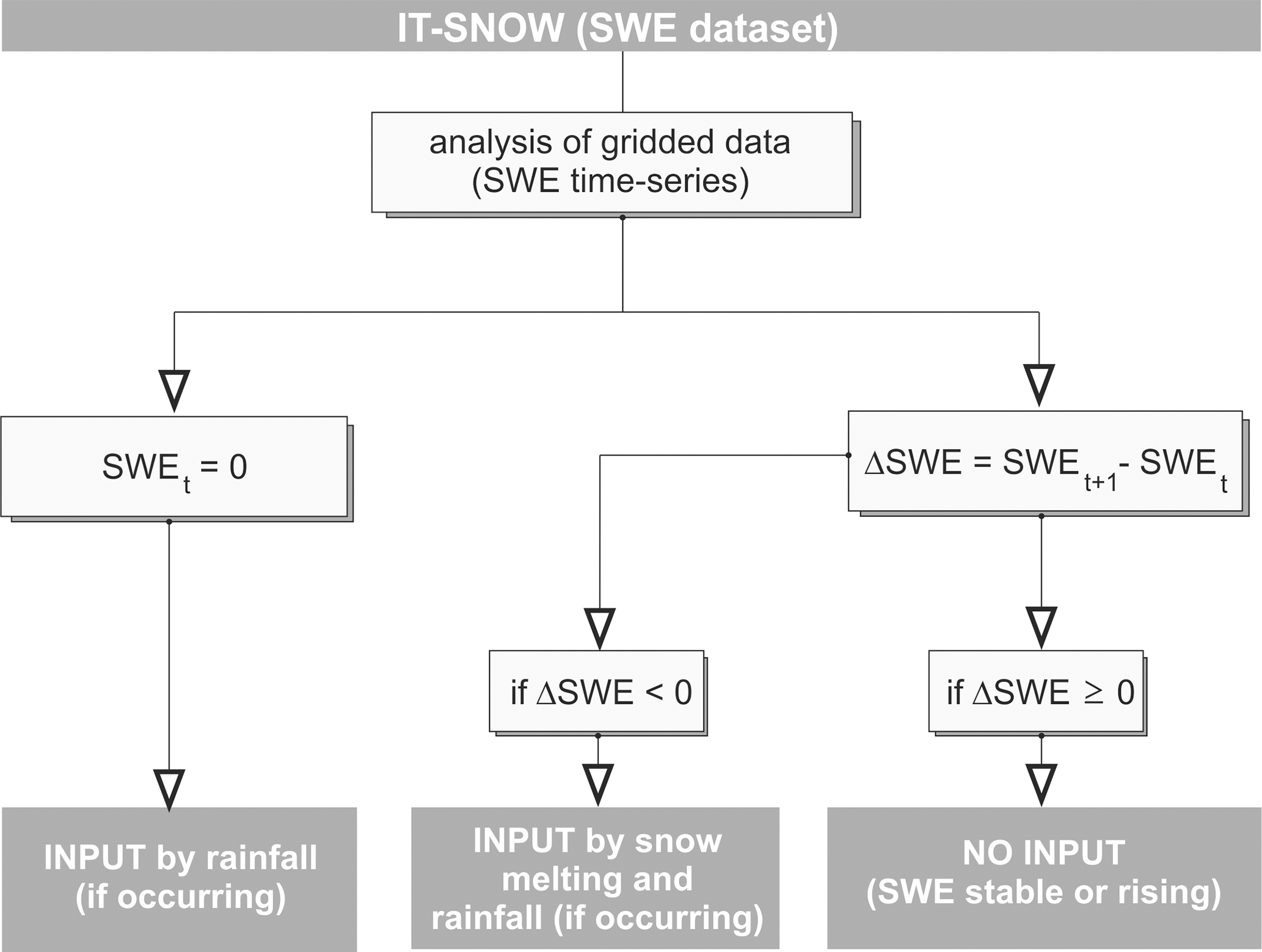 To address data scarcity, complementary precipitation (P) products were used to estimate rainfall (Prain) and snowmelt (Psnow) at different spatial and temporal resolutions over the MDU catchment. Table 1 summarizes the basic characteristics of datasets at the regional and global scales. Snow Water Equivalent (SWE) data from the IT-SNOW dataset were used to extract and analyze monthly snowmelt contributions (Psnow) over the MDU catchment. The analysis was carried out following the workflow in Fig. 2. In detail, when SWE was zero (no snow), the precipitation (if present) was the only input to the system (Prain). When snow cover was present, a day-by-day and cell-by-cell evaluation was conducted to assess changes in SWE relative to the previous day (ΔSWE). For ΔSWE <0, it was assumed that snowmelt occurred, contributing to Psnow.