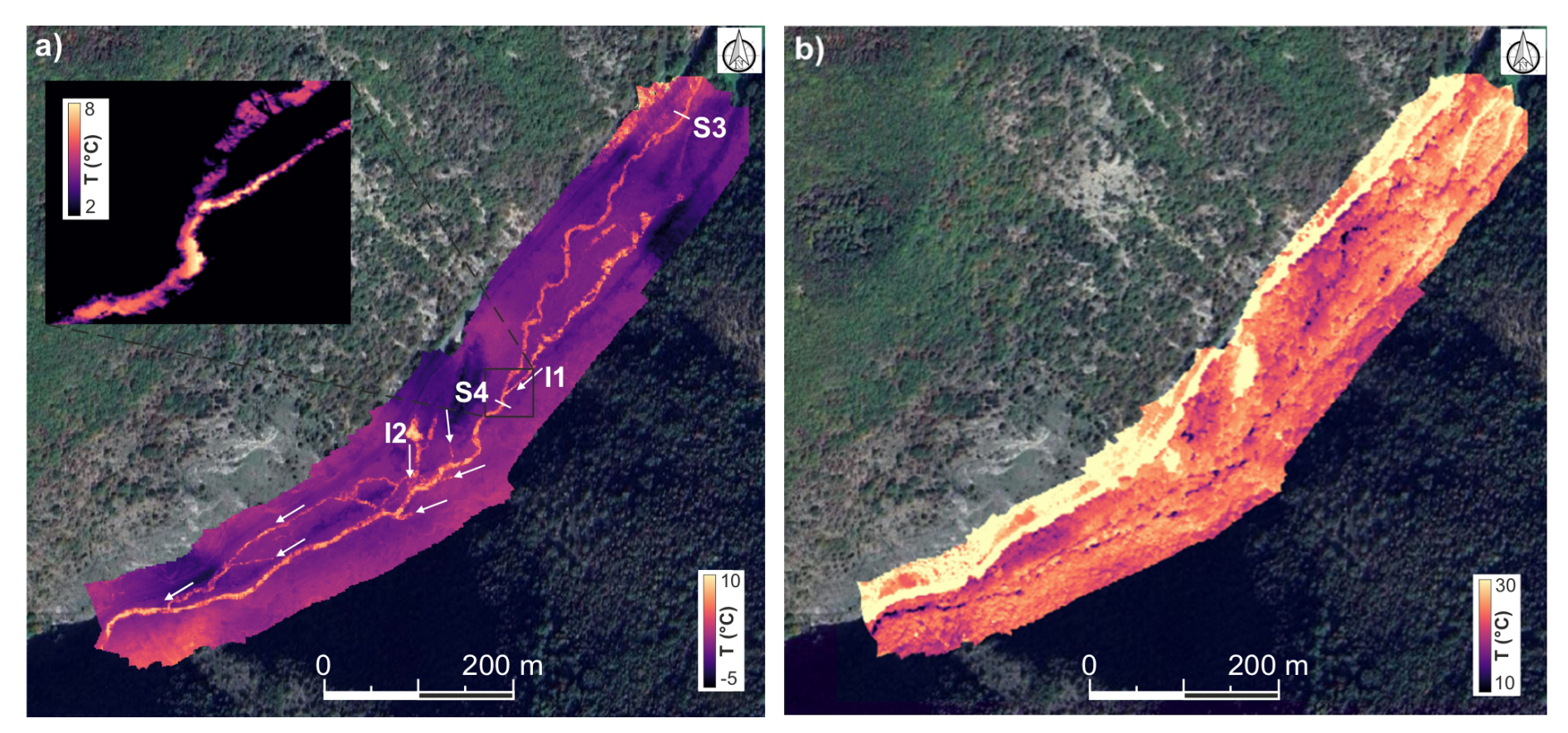 The thermal drone imagery helps identify stream stretches with groundwater inflow, thereby defining geochemical sampling points, as described in Sect. 2.4.