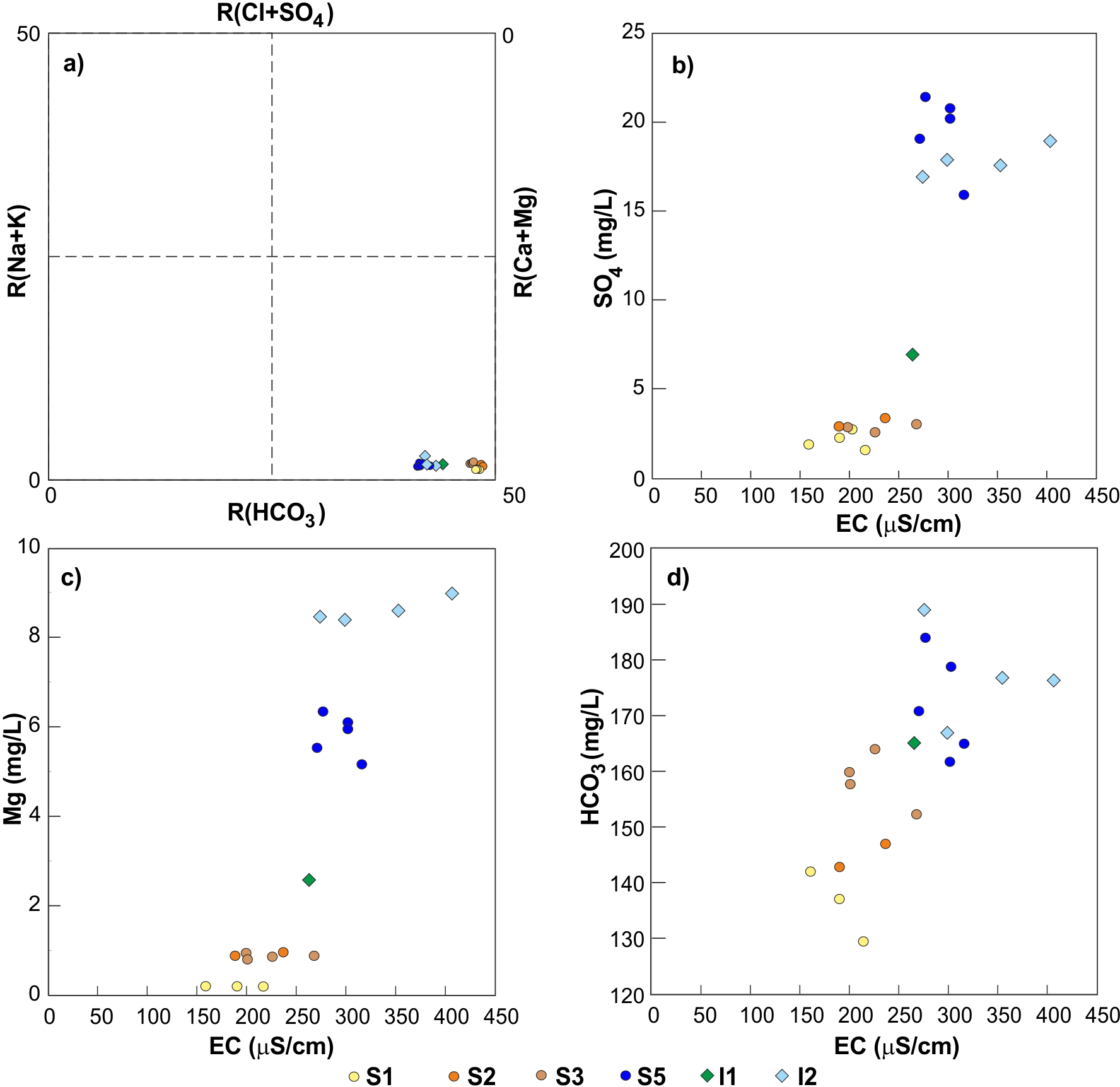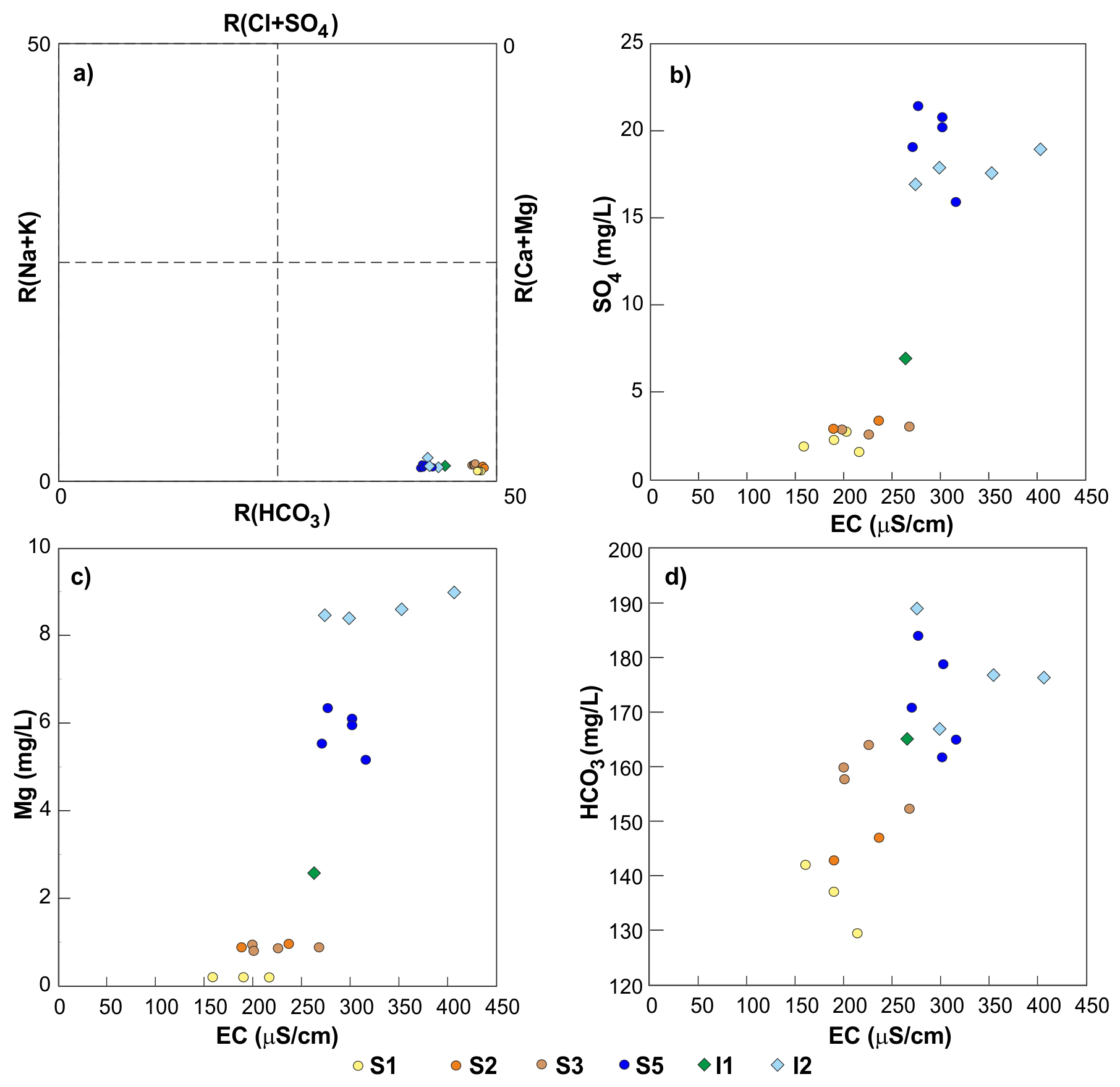 Figure 6(a) Langelier-Ludwig diagram for the Ussita stream; (b) sulphate concentrations vs EC values; (c) Magnesium concentrations vs EC values; (d) Alkalinity vs EC values. For the location of sampling points, see Fig. 1.