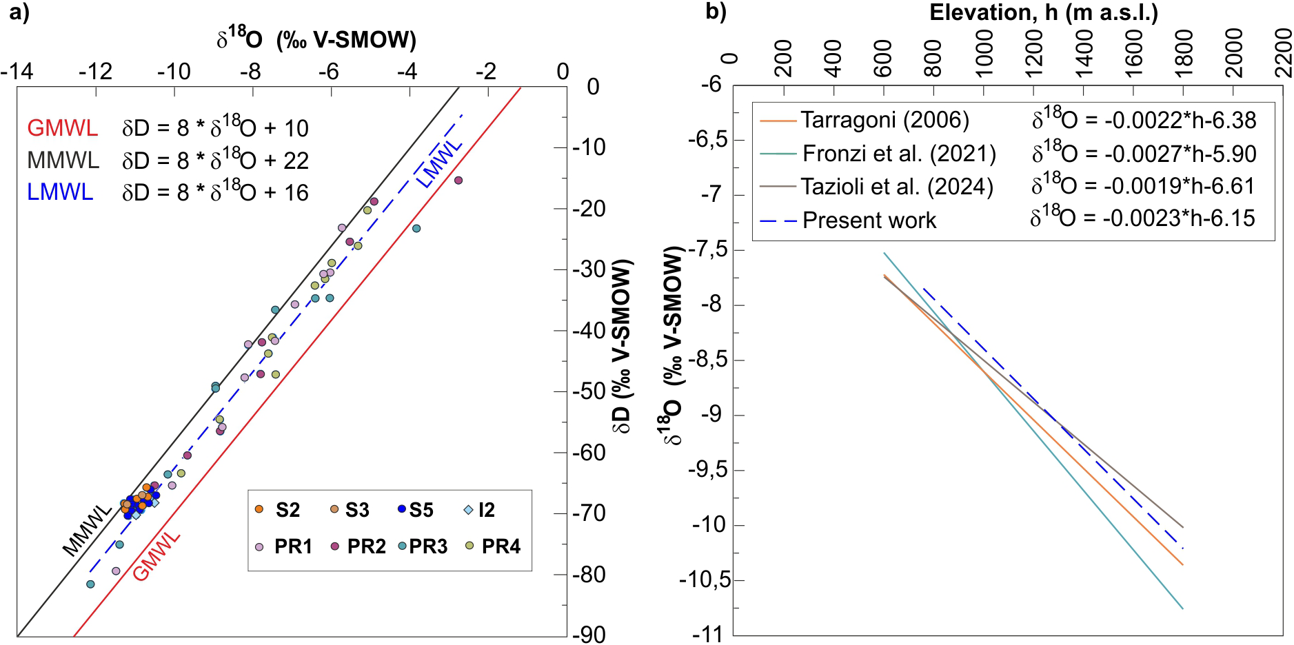 Figure 7(a) δD vs δ18O values of precipitation samples with the resulting linear regression (Local Meteoric Water Line, LMWL), compared with the Global Meteoric Water Line (GMWL) and the Mediterranean Meteoric Water Line (MMWL); (b) Linear regression between δ18O and elevation determined by four water collectors (PR) with those proposed by Tarragoni (2006), Fronzi et al. (2021), and Tazioli et al. (2024). For the location of sampling points, see Fig. 1.