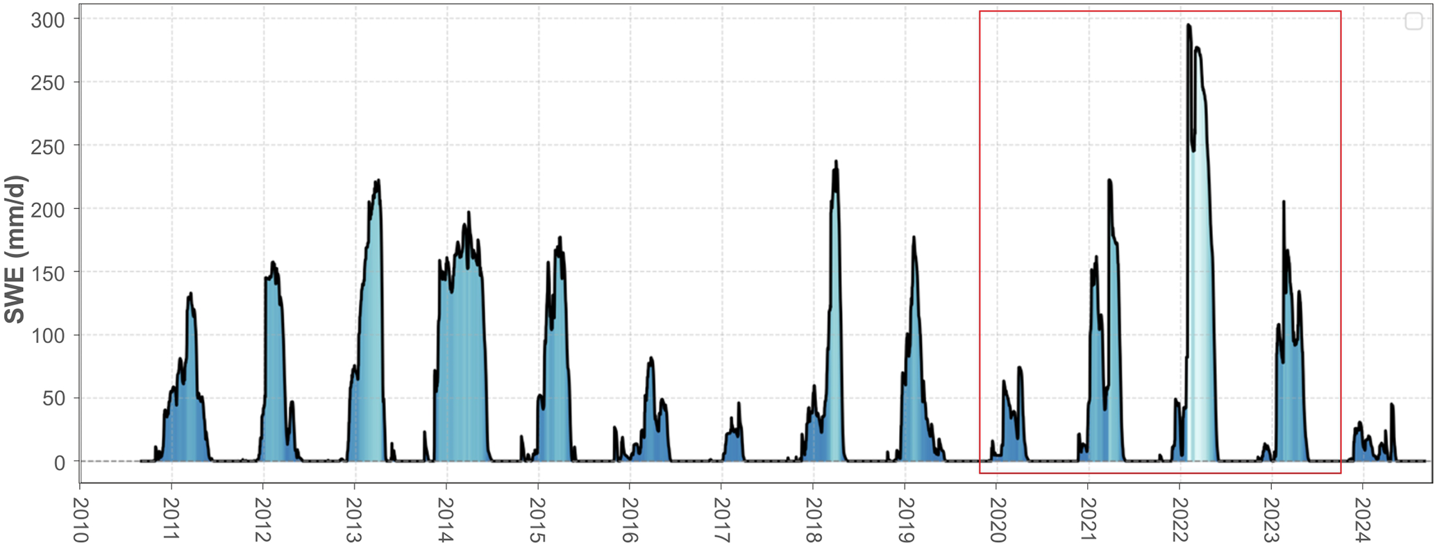 Snow depth was measured at two stations (Monte Bove Sud and Pizzo Tre Vescovi; see Fig. S1). However, during the investigation period, they exhibited substantial data gaps, rendering them unsuitable for analysis. It is a common issue in the mountain regions of the Italian Apennines and Alps, where the presence of precipitation and snow depth monitoring stations at higher elevations is scarce or not representative of the mean altitude of mountain catchments (Cambi et al., 2010; Daly et al., 2017; Ly et al., 2013; Di Matteo et al., 2017; Avanzi et al., 2024b; Girotto et al., 2024). Whereas the role of snowmelt cannot be neglected in the highest-elevation areas of Mediterranean catchments, which receive most of their winter/spring precipitation as snow, this is less of a concern in mid-elevation areas, which have a mixed precipitation regime (e.g., Fayad et al., 2017).