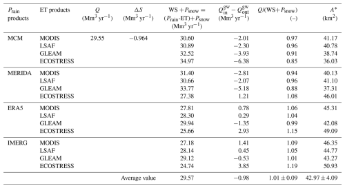 Monthly Evapotranspiration (ET) was estimated and then aggregated at the hydrological-year scale using remote-sensing estimates (Table 1). Moreover, the Thornthwaite-Mather (T-M) method (Thornthwaite and Mather, 1955, 1957) was used to estimate ET from ground-based meteorological data (see Supplement Sect. S2). More detailed descriptions of the P, SWE, and ET products, along with uncertainty taken from the literature (when available), are provided in the Sect. S1.