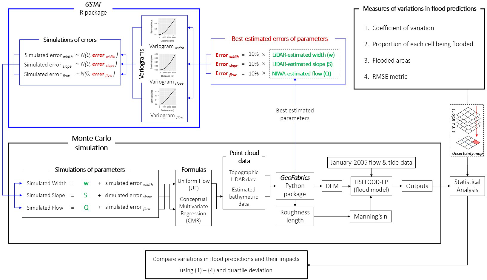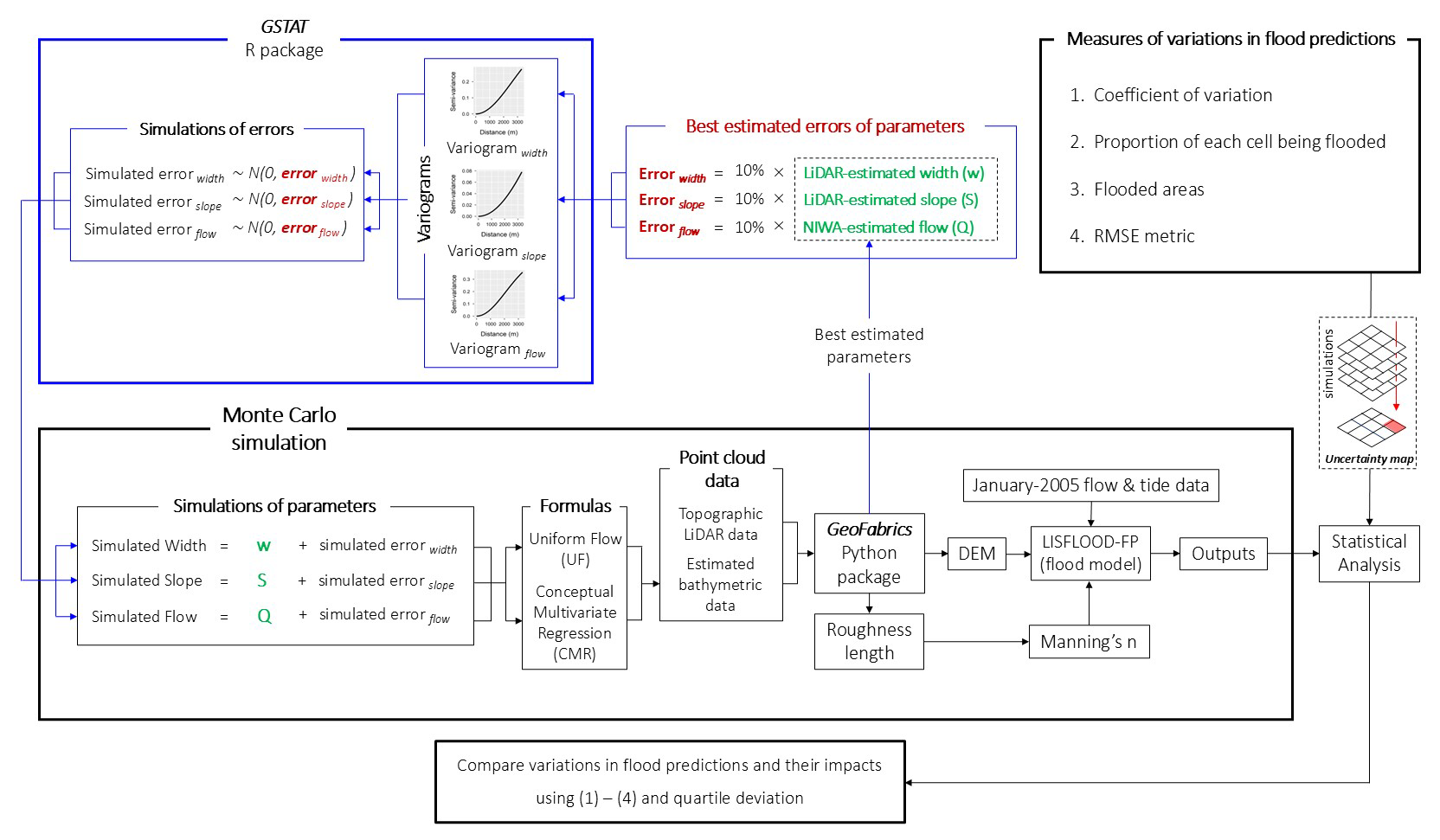 To fill these gaps, we quantified the uncertainty in flood predictions due to errors in the estimated parameters used in two formulas described in Rupp and Smart (2007) and Neal et al. (2021), and validated by Pearson et al. (2023). Within the Monte Carlo framework, we generated multiple realisations of river bathymetry, then used them to perform a sensitivity analysis to evaluate the impacts of each parameter on flood predictions, individually and collectively. We also considered the spatial variability in the analysis and whether our number of simulations is large enough to represent our results. This work can contribute to studies of other sources of uncertainty to adequately comprehend the uncertainty in flood model outputs. In the next section, we describe a method to explore relationships between the parameters within those two formulas and show a process to examine how errors in these parameters affect the flood predictions.