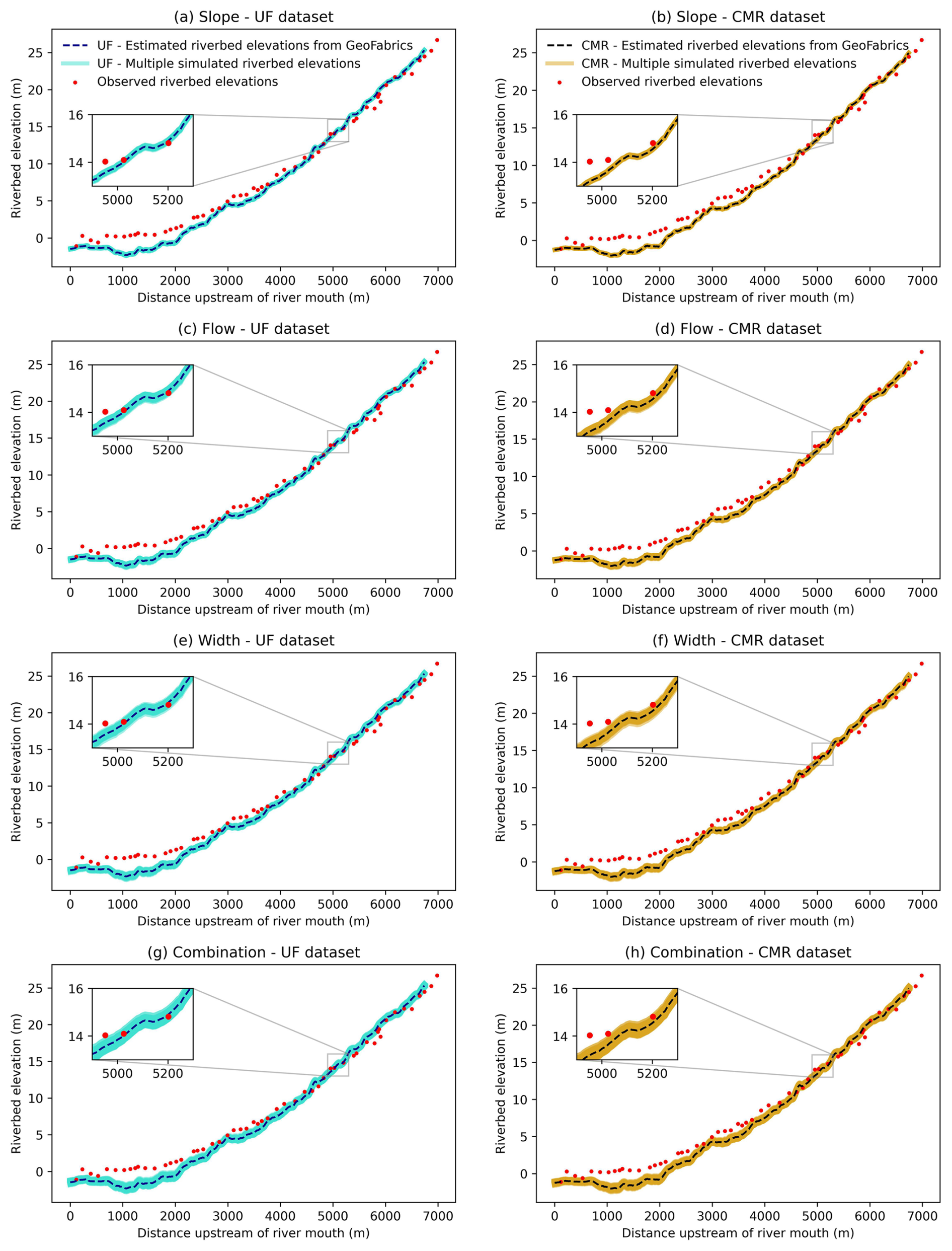 Figure 3Observed cross-sectional, best estimated (from GeoFabrics of Pearson et al., 2023), and simulated riverbed elevations at the Waikanae River. The best estimates and simulations of riverbed elevations computed using the Uniform Flow formula are in the first column: (a) slope, (c) bank-full flow, (e) width, and (g) combined. The ones calculated using the Conceptual Multivariate Regression formula are in the second column: (b) slope, (d) bank-full flow, (f) width, and (h) combined. The color shading represents multiple simulated riverbed elevations (span of simulations).
