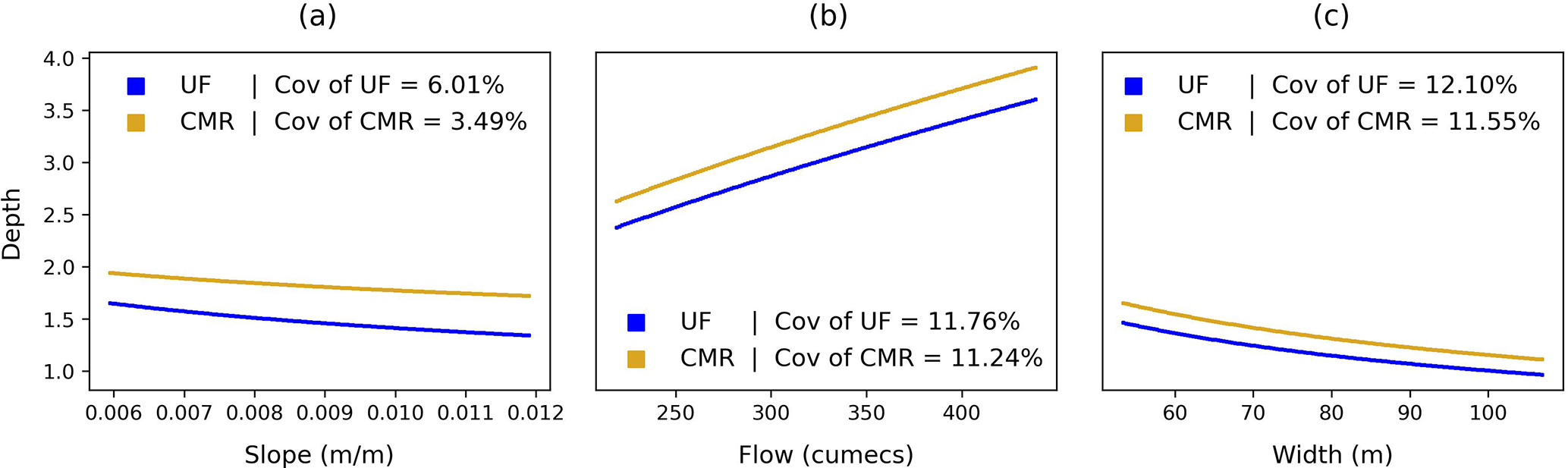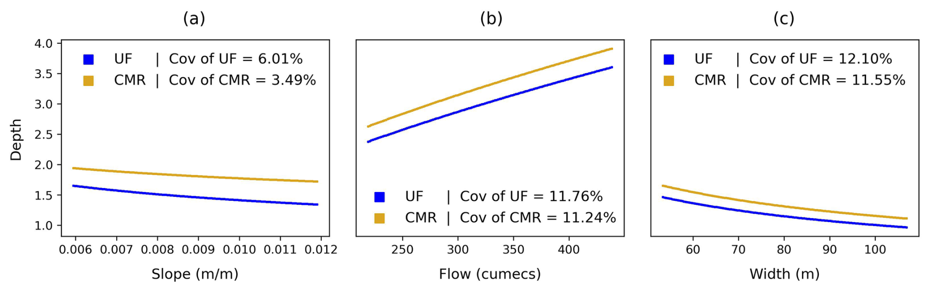 Apart from that, in Fig. 4, the river bathymetry estimated by the CMR formula is generally greater than that estimated by the UF formula. This difference arises from many factors, but mainly from the friction and its exponent in this case. The mean friction along the river used for the UF formula (0.0432) is lower than the constant friction (0.162) in the CMR formula. Also, its exponent in the UF formula (0.6) is higher than in the CMR formula (0.573). However, when considering other factors, for instance, if the width continues to increase and the slope or flow decreases, the river bathymetries estimated by both formulas can converge, switch positions, and then diverge again. Besides, based on the CoVs, for the same amount of variation in the parameters, the river bathymetries estimated by the UF formula have higher variability than that estimated by the CMR formula. To explain, the exponents of the slope (0.3), flow (0.6), and width (0.6) in the UF formula are higher than in the CMR formula (0.175, 0.573, 0.573, respectively).