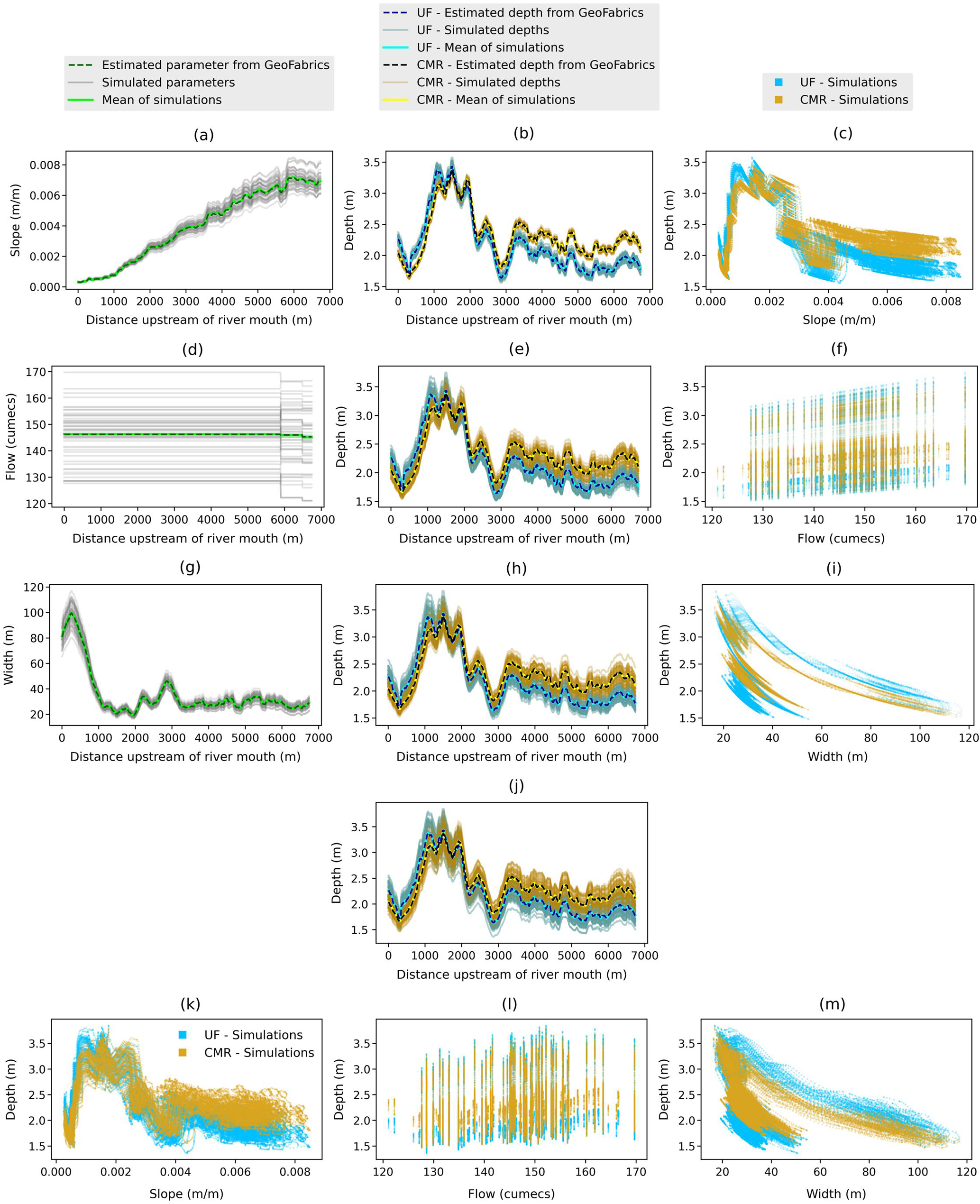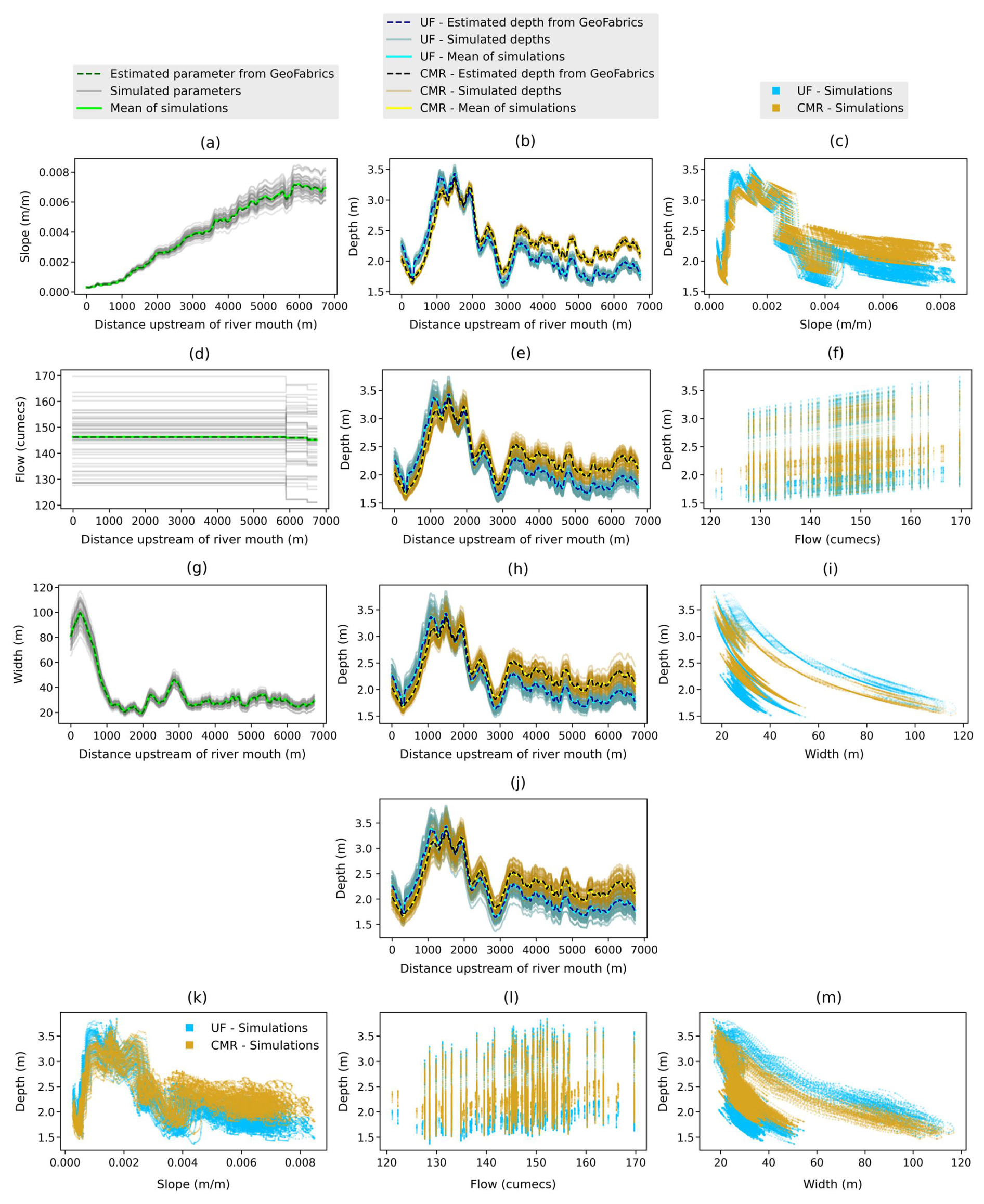 For the combined dataset, Fig. 5j–m show the same patterns as what we found above when analysing each parameter dataset. Specifically, in the upstream reach, the simulated bathymetries and bank-full flows are not strongly correlated with each other. Apart from that, the simulated river slopes decrease as the simulated bathymetries increase. Finally, the shapes of the simulated river widths are reserved versions of the simulated river bathymetries, showing their inverse relationship.