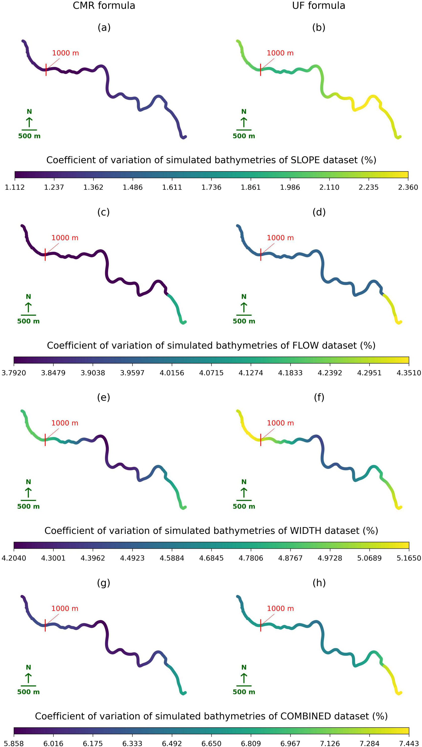 Figure 6 shows the variations in the simulated bathymetries across the spatial domain when the associated error distributions with the same percentage standard deviation were added into the slope, flow, and width both individually and simultaneously. In both formulas, the ranges of coefficients of variations increases between the slope, flow, and width datasets. It indicates that the variation in the river width is associated with the largest variability in the river bathymetries, followed by the river flow and slope. Moreover, the colours of the UF-formula river bathymetries are darker than those of the CMR-formula ones. This demonstrates the UF-formula bathymetries exhibit larger variability than those from the CMR formula. These all results are consistent with the findings in Sect. 3.1.